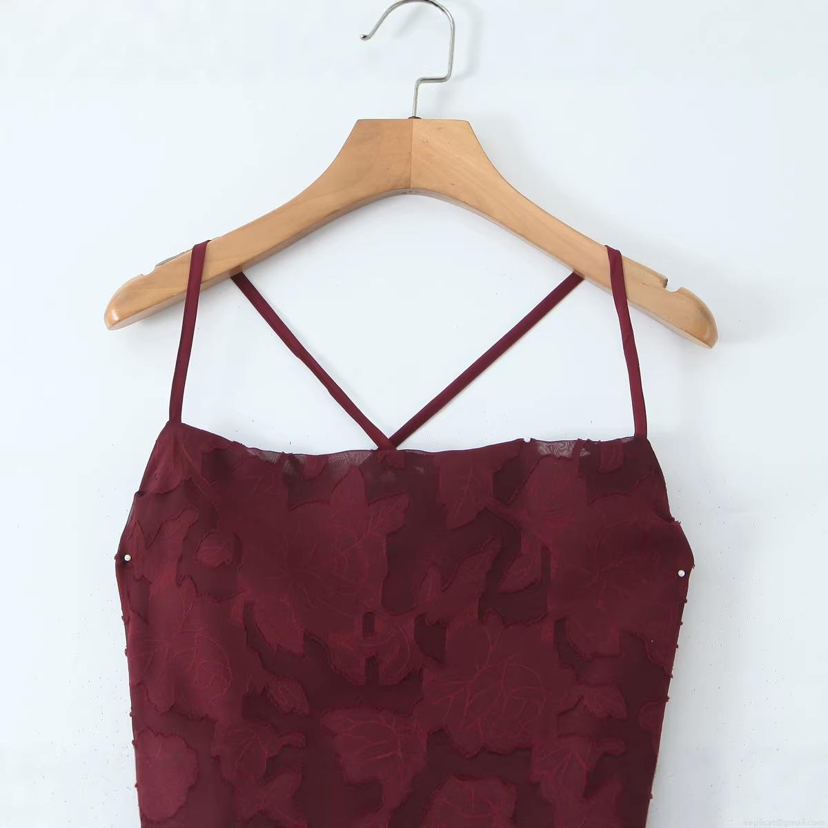 Women's Elegant Wine Red Burnout Floral Spaghetti Strap Midi Dress Sexy Backless Lace-up Slim Fit Party Evening Gown Dress