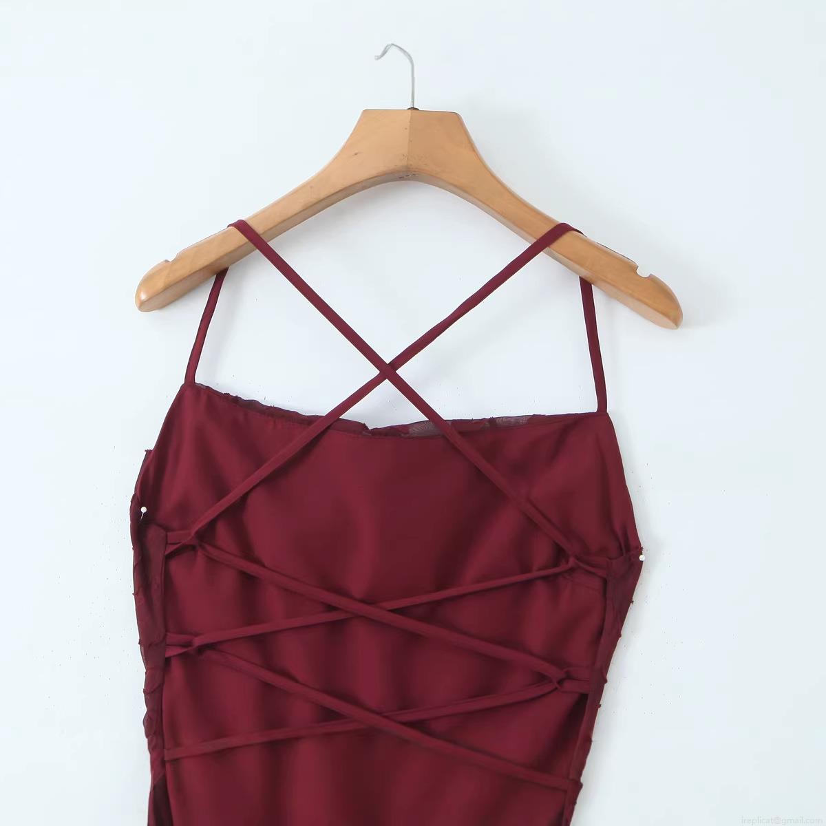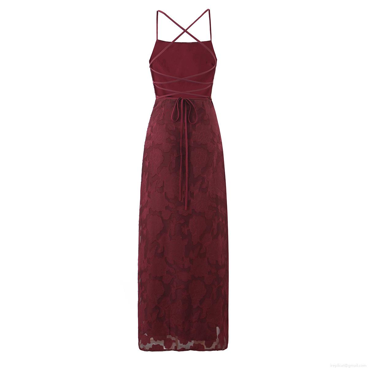 • Women's Elegant Wine Red Burnout Floral Spaghetti Strap Midi Dress Sexy Backless Lace-up Slim Fit Party Evening Gown Dress