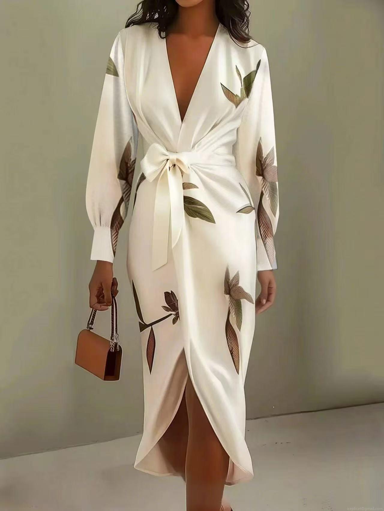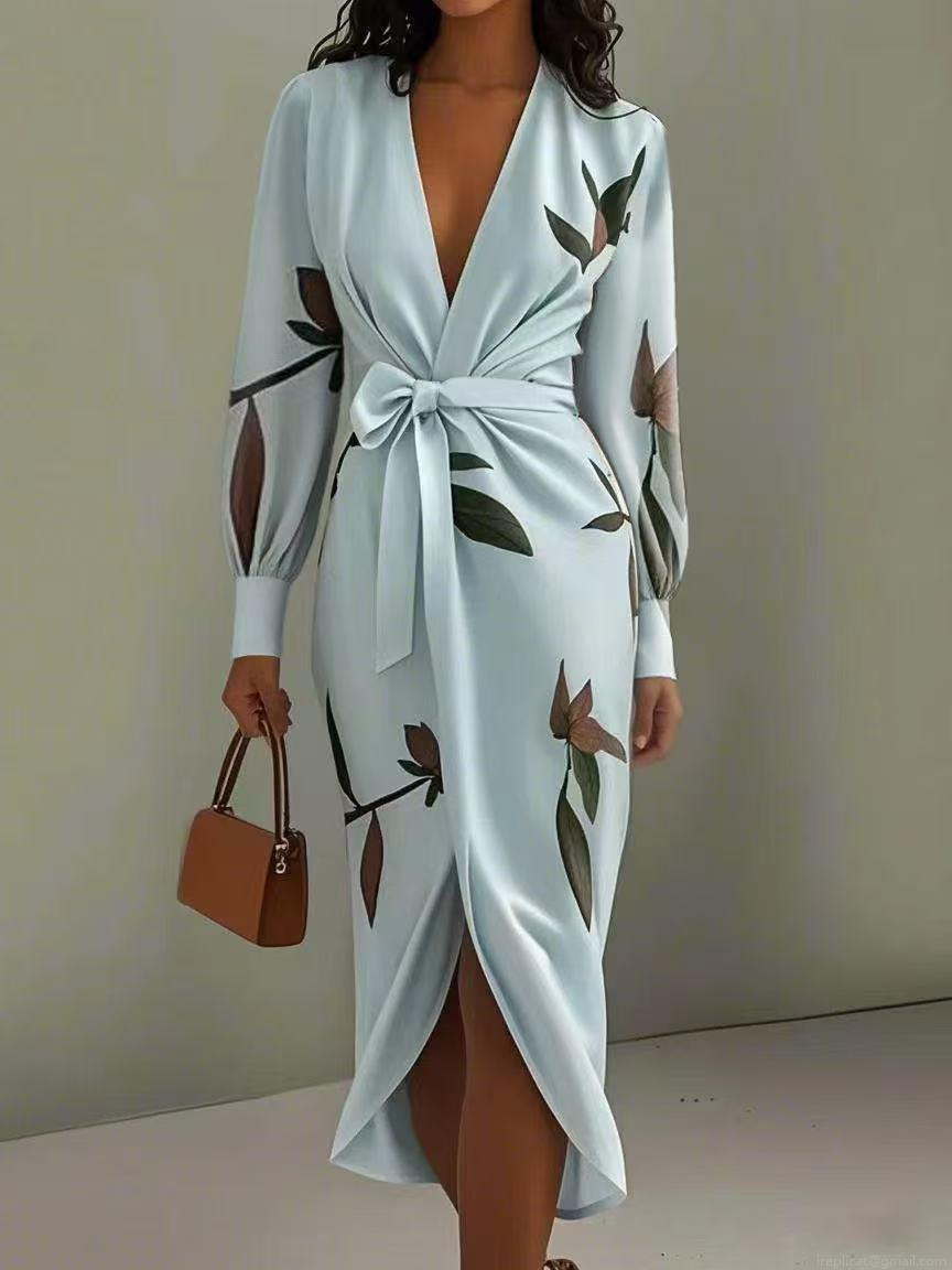 • Women's Elegant Wrap Dress Satin Polyester Deep V-Neck Long Sleeve Floral Leaf Print Belted Midi Dress For Date Office Daily Wear