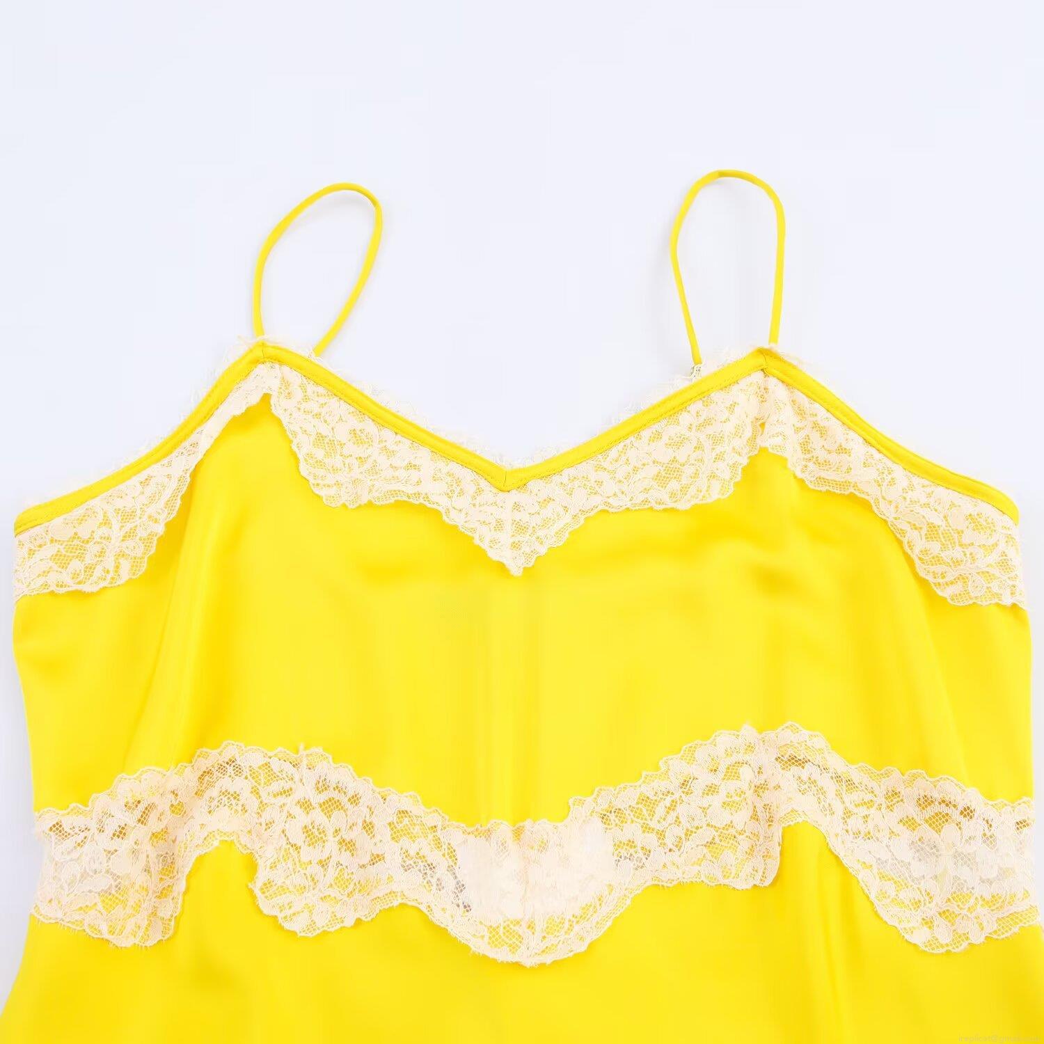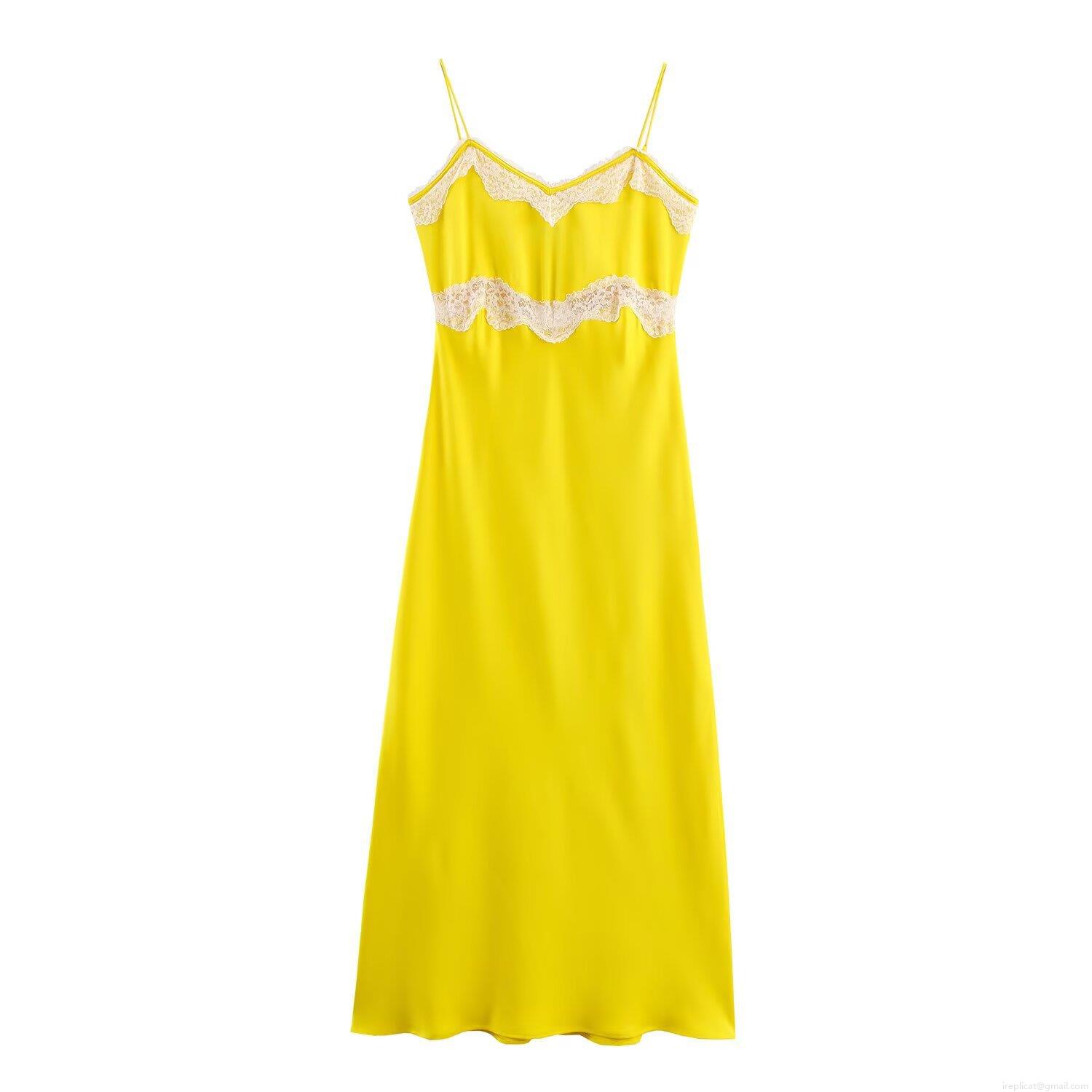 Women's Elegant Yellow Satin Midi Dress White Lace Trim Spaghetti Strap V-Neck Patchwork Sleeveless Summer Party Club Dress For Ladies
