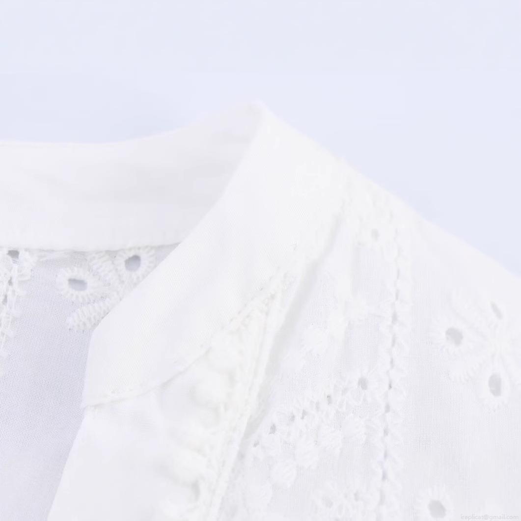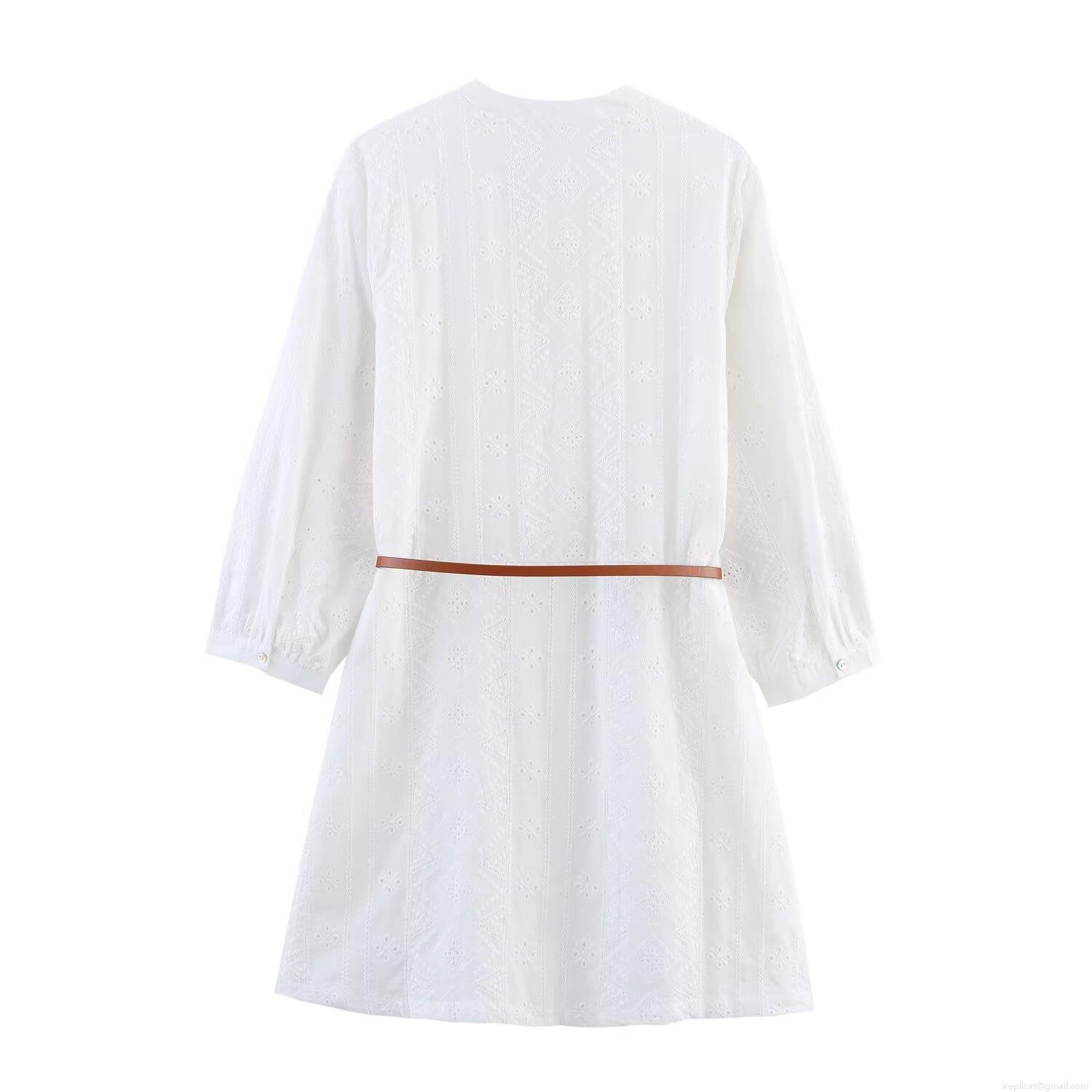 • Women's Embroidery Hollow Out Midi Shirt Dress With Belt Cotton Blend Long Sleeve Button Down V Neck Elegant Dress For Casual Party White