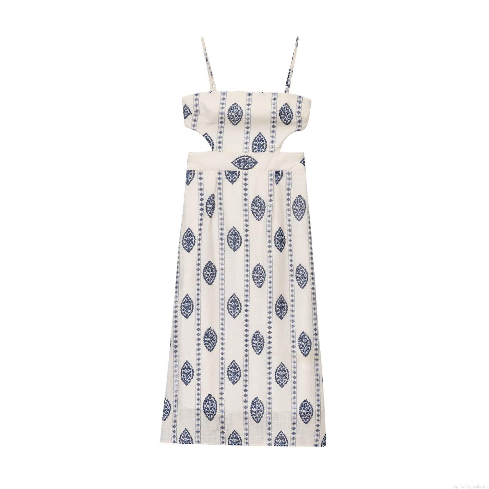 • Women's Ethnic Leaf Print Midi Dress Hollow Out Waist Spaghetti Strap V Neck Sexy Slim Fit Imitation Linen Dress For Summer Vacation Party Chic