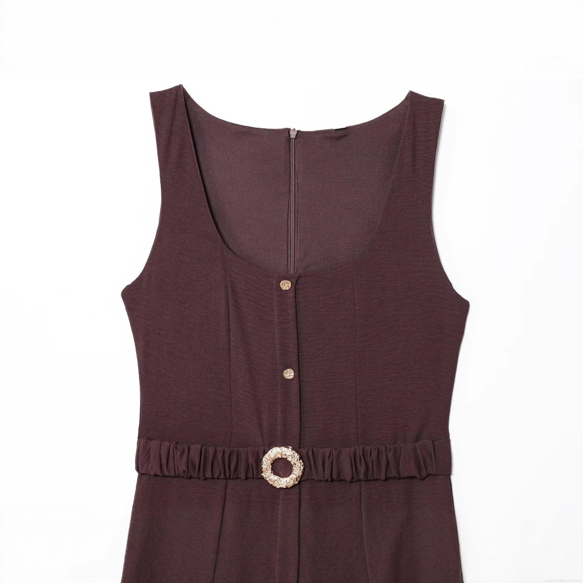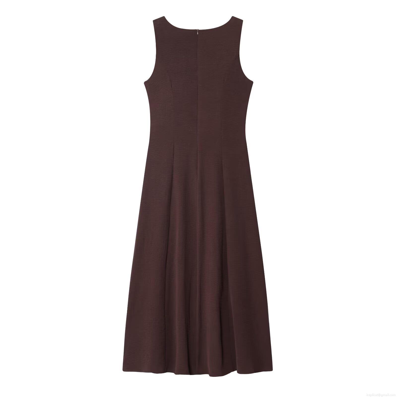 • Women's European Style U-Neck Sleeveless Single-Breasted Midi Dress With Belt Solid Color Polyester A-Line Dress For Streetwear Party Autumn Coffee Brown