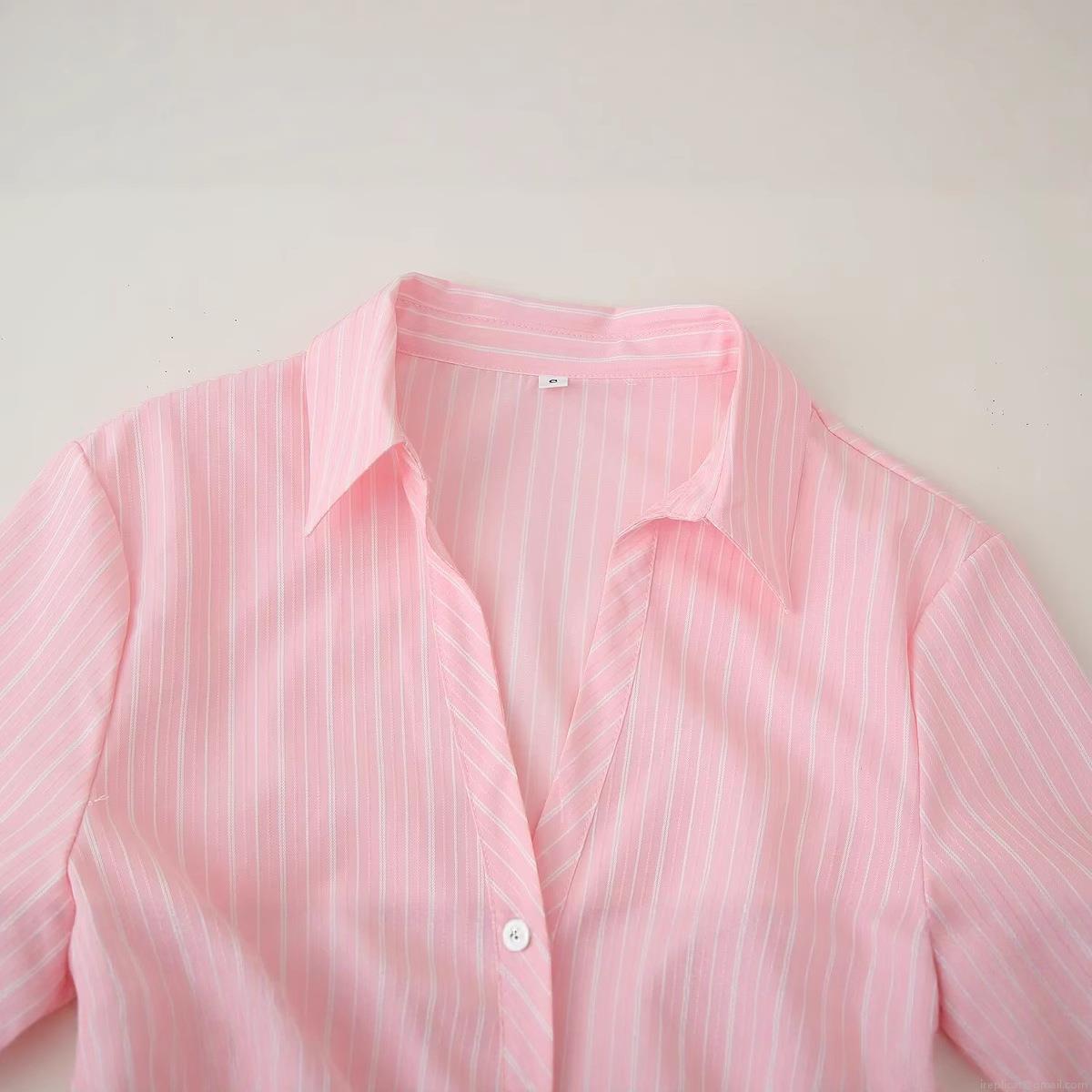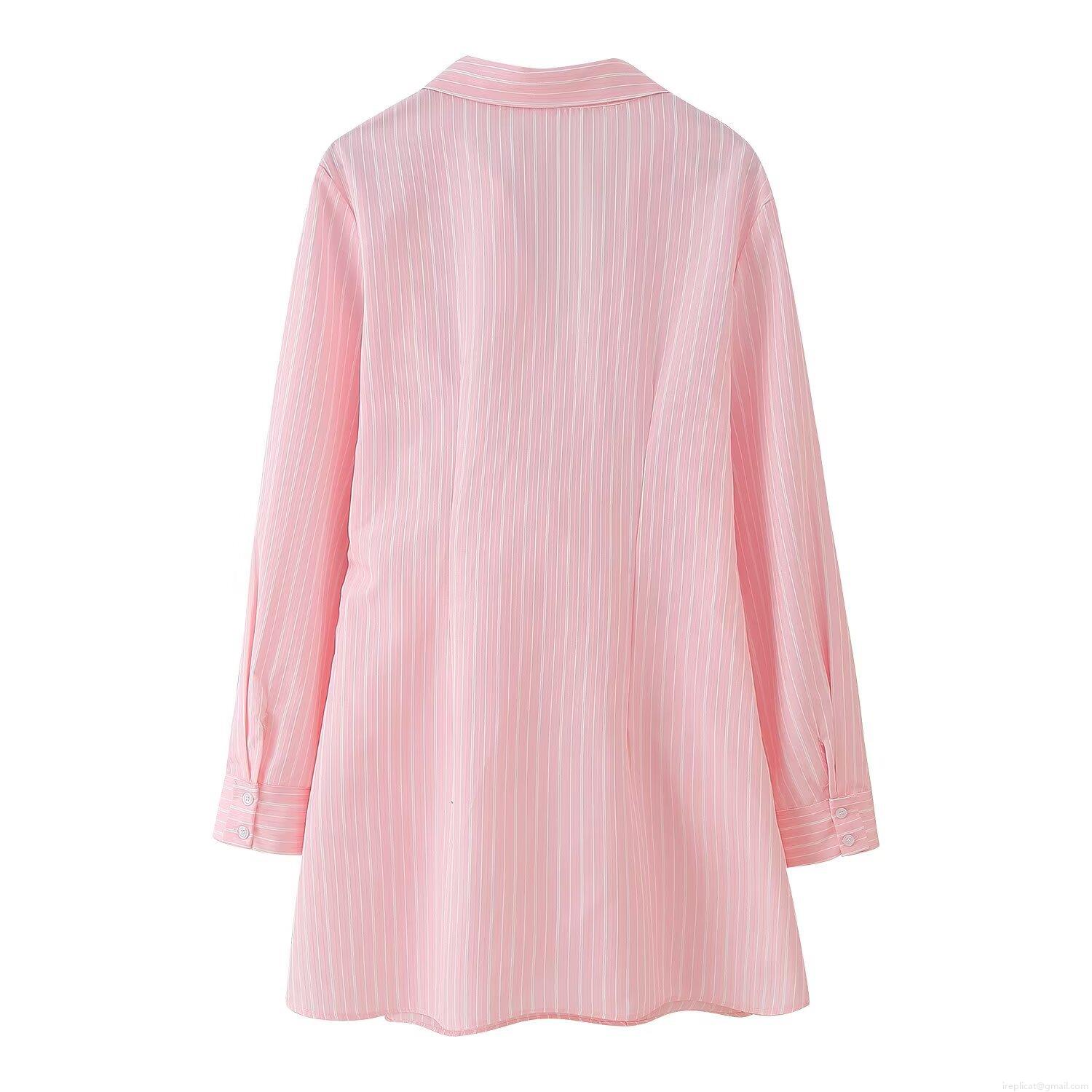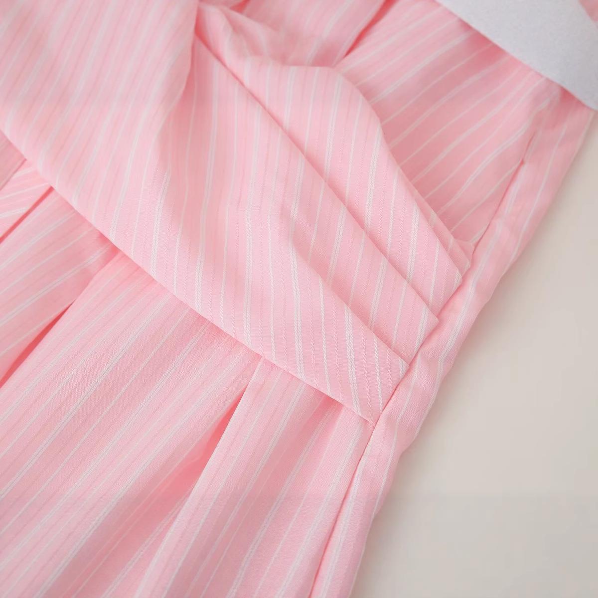 Women's European Style V-Neck Long Sleeve Pleated Shirt Dress Pink White Striped Midi Dress Polyester Blend Elegant Slim Fit Dresses For Spring Summer