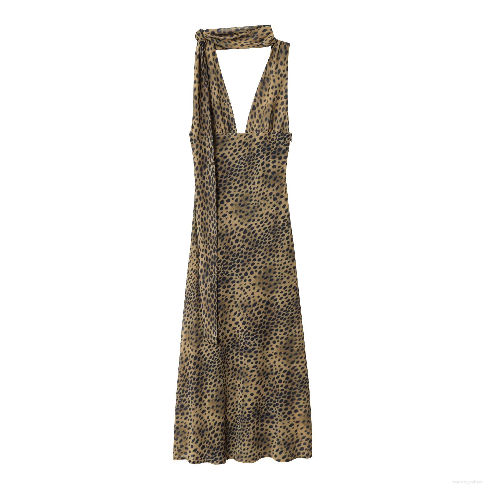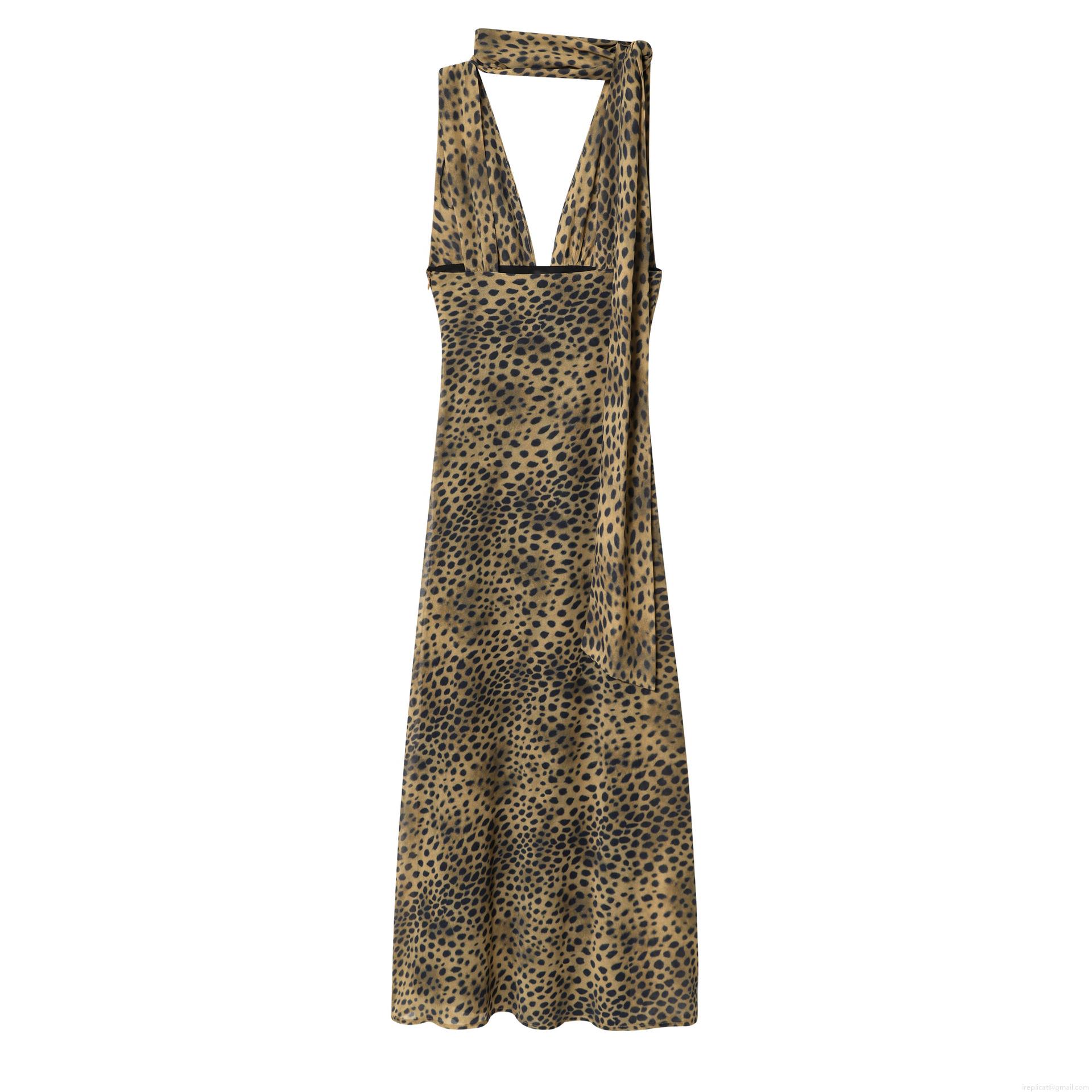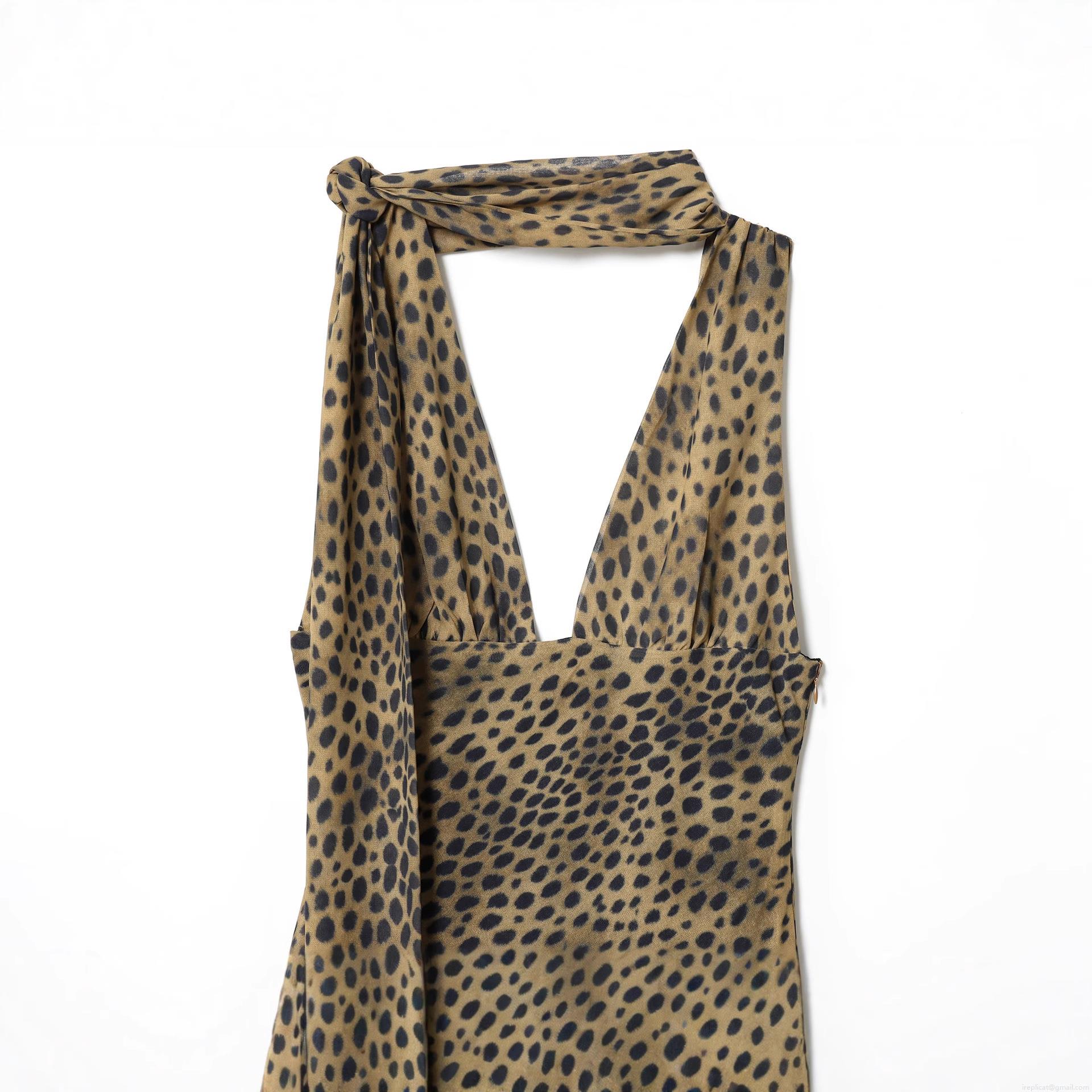 • Women's Fashion Leopard Print Halter Neck Dress Sleeveless Backless Chiffon Midi Dress For Vacation Party Elegant Slim Fit Bodycon Sundress