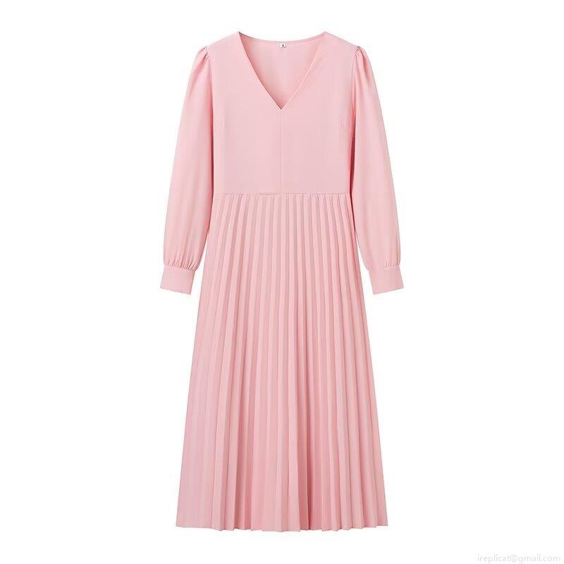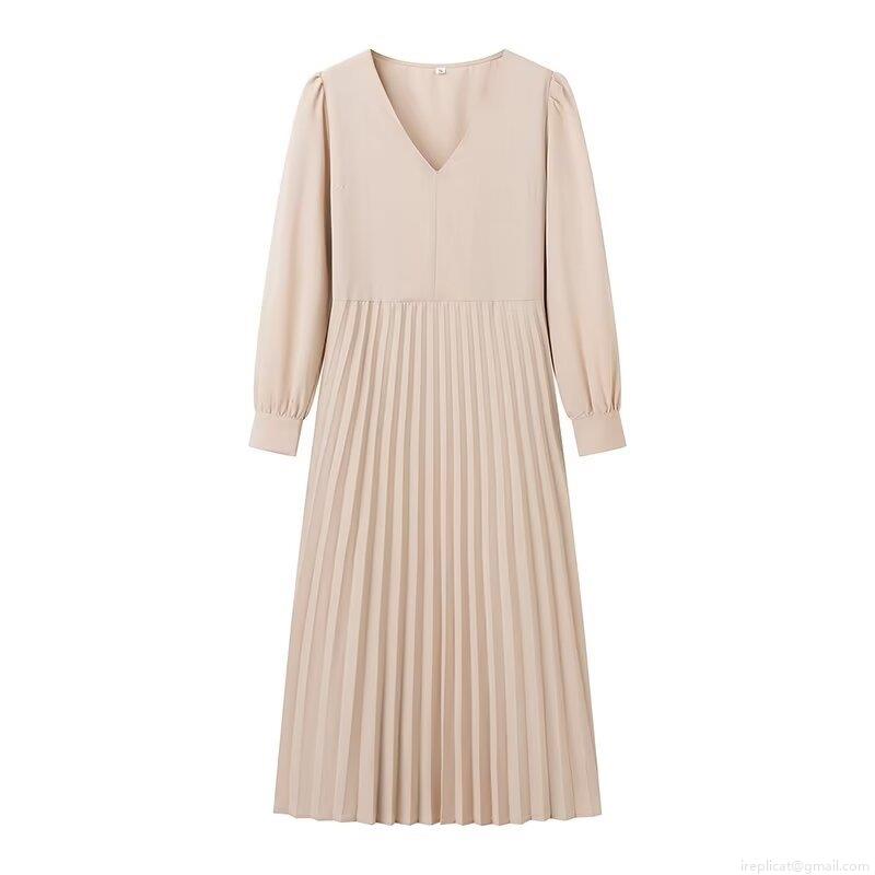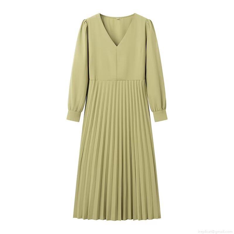 • Women's Fashion V-Neck Pleated Midi Dress Summer Elegant High Waist Lace-up Long Sleeve Solid Color A-Line Dress For Streetwear Party Office