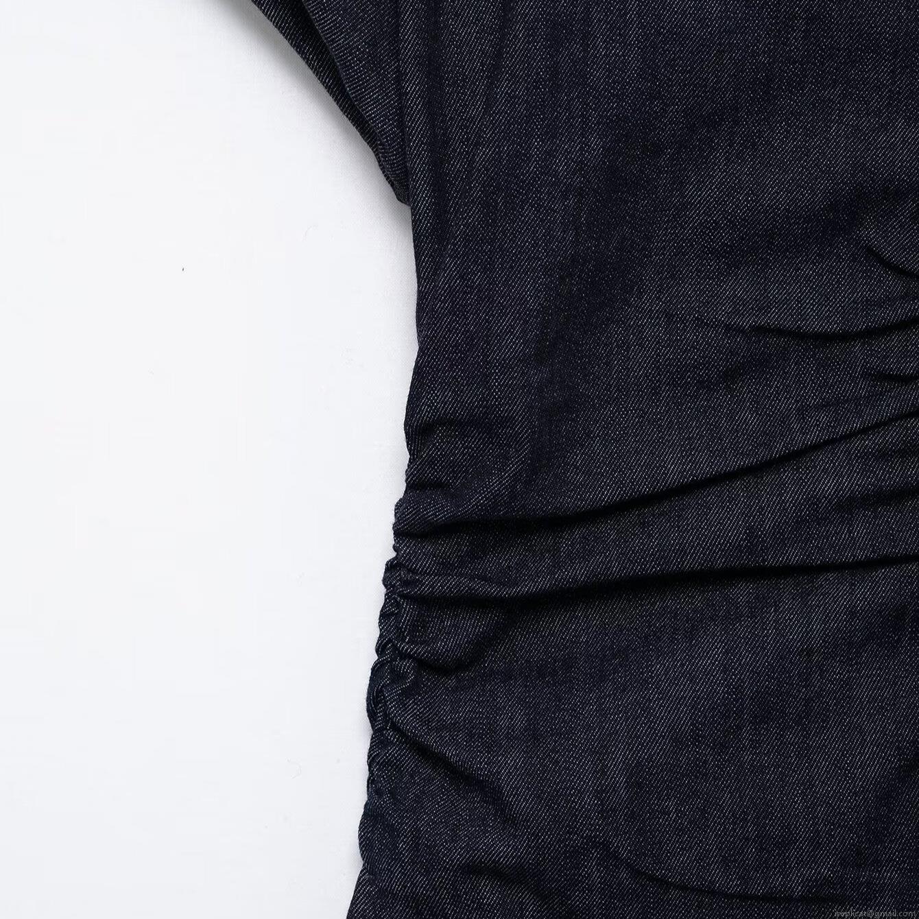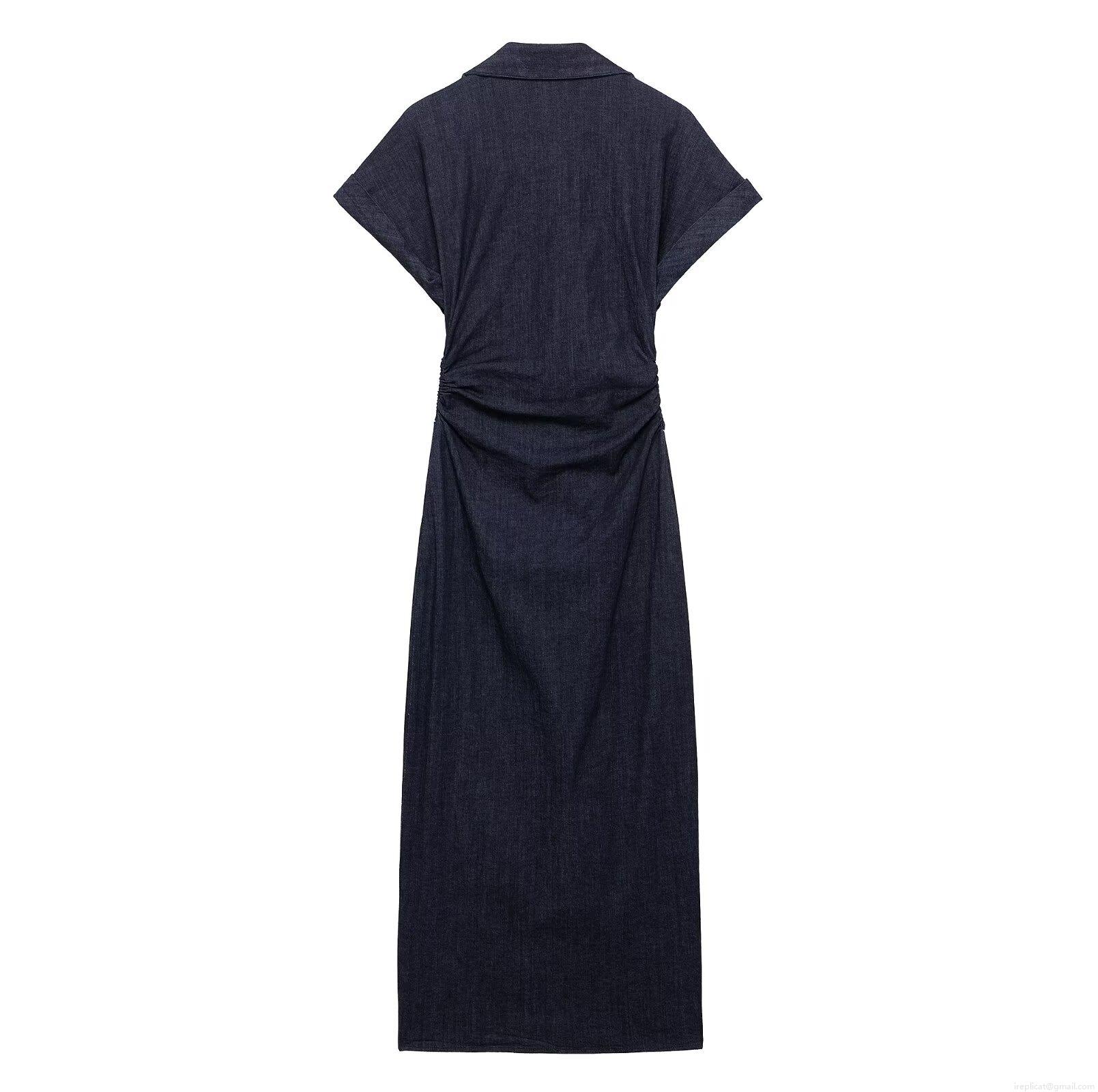 Women's Fashion V-Neck Slim Fit Denim Midi Dress Short Sleeve Button Down Waist Pleated Casual Elegant Jean Dress for Spring Summer