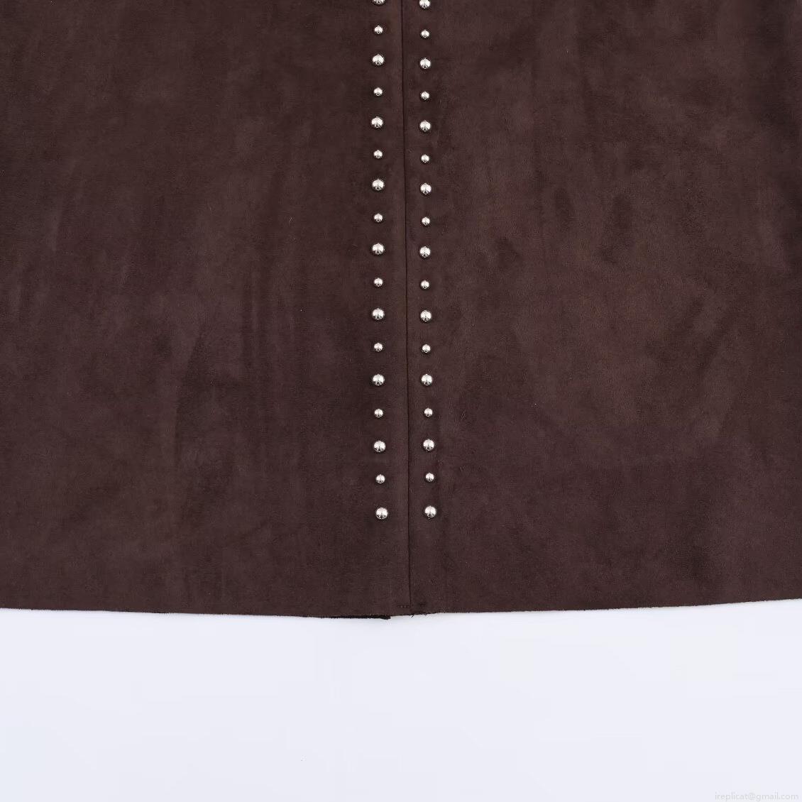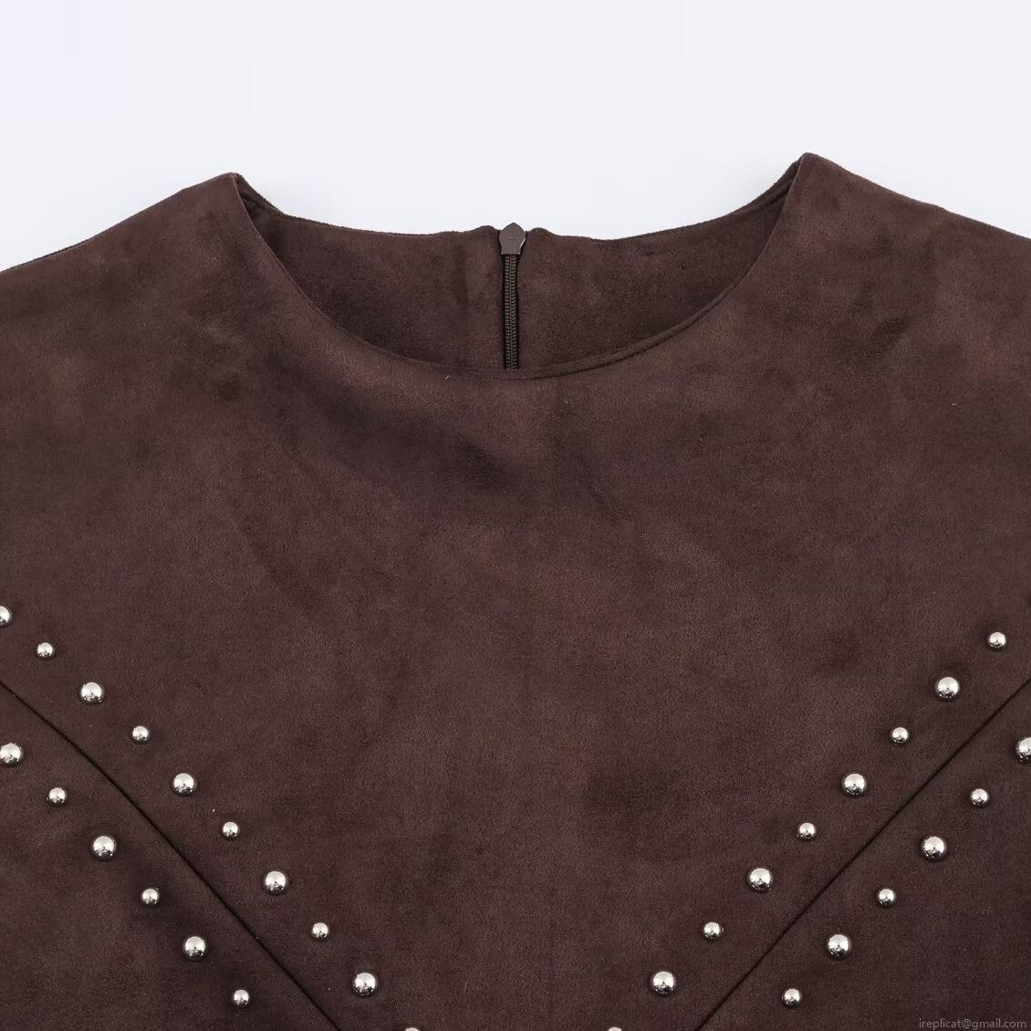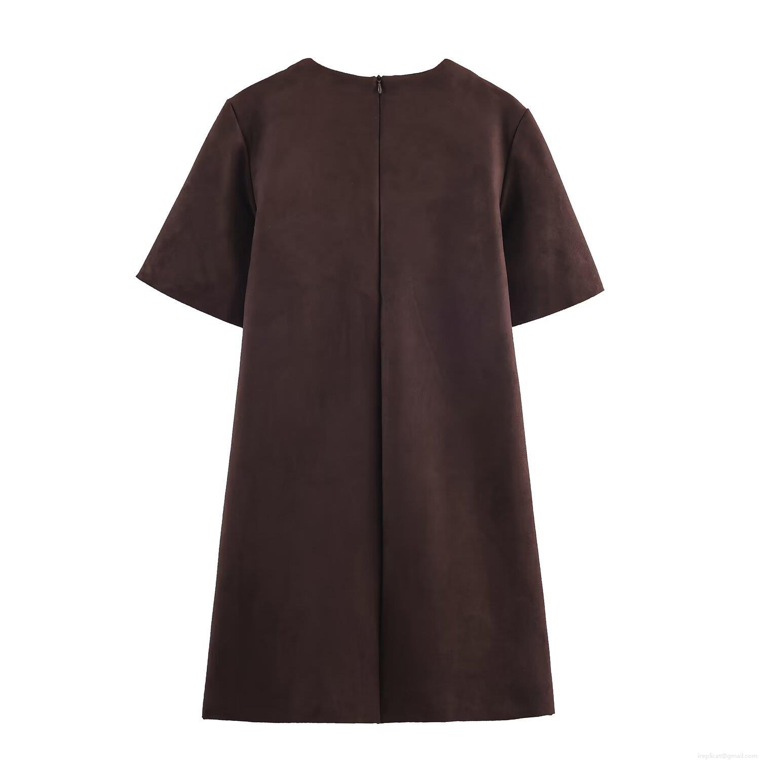• Women's Faux Suede Short Sleeve Dress With Metal Studded Decoration Round Neck A-Line Midi Dress Casual Solid Color Autumn Fashion Party Dress For Women