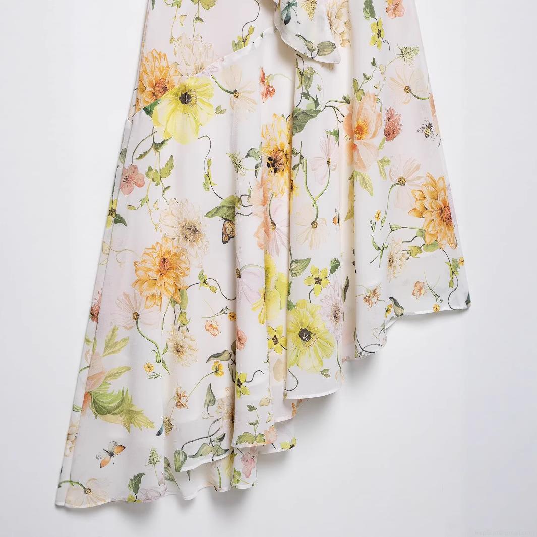 Butterfly, Floral Pattern, Flowers, Printing, Neckband, Lace, Irregular Hem, Pleated Collar