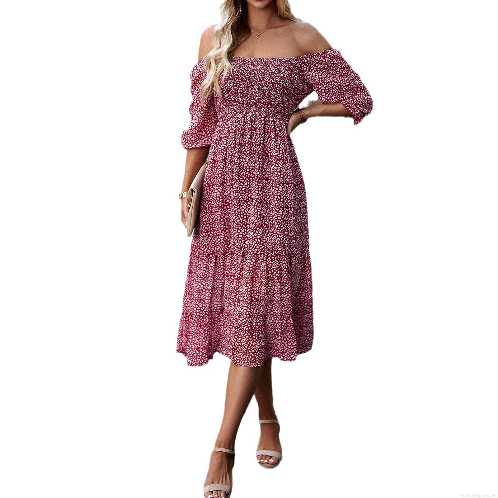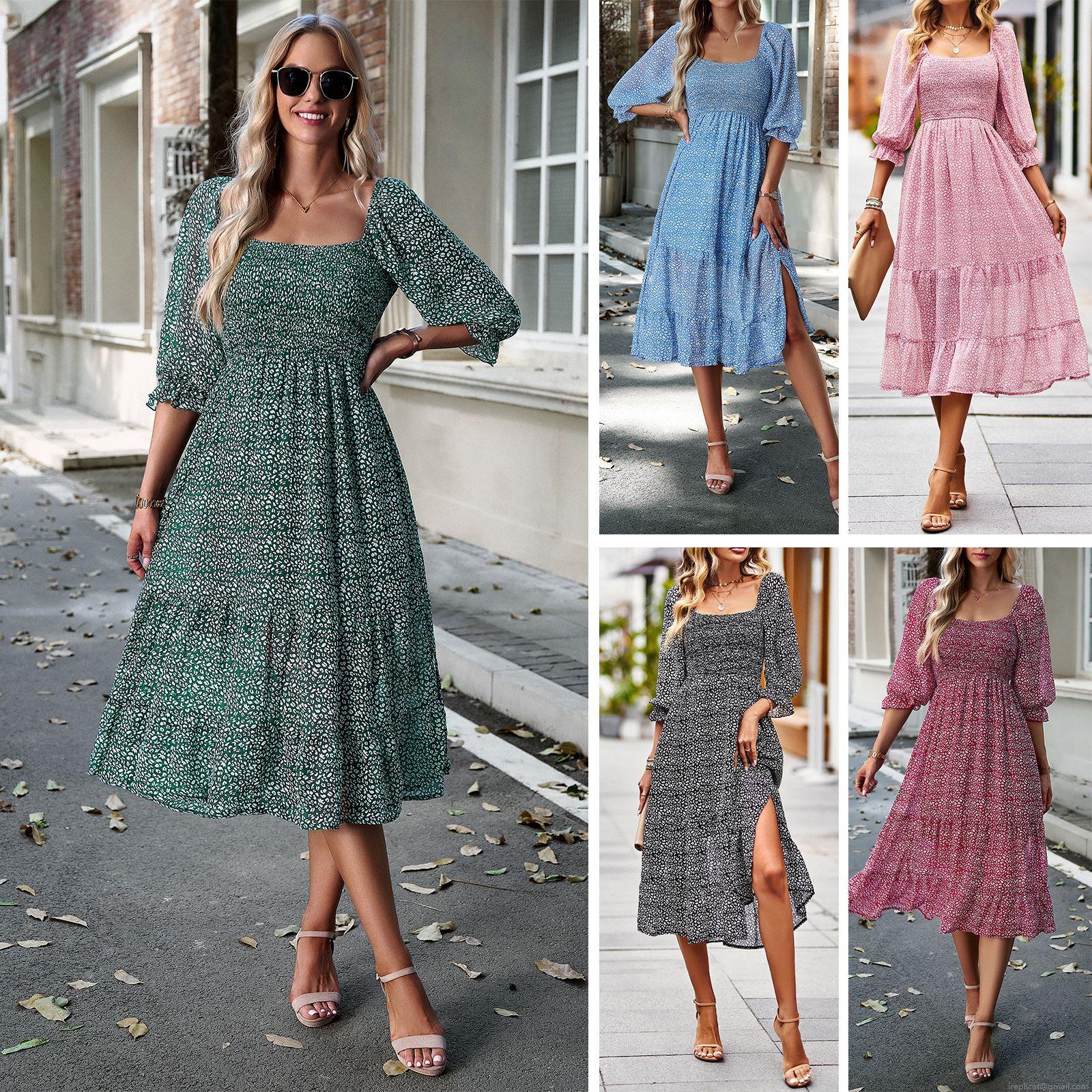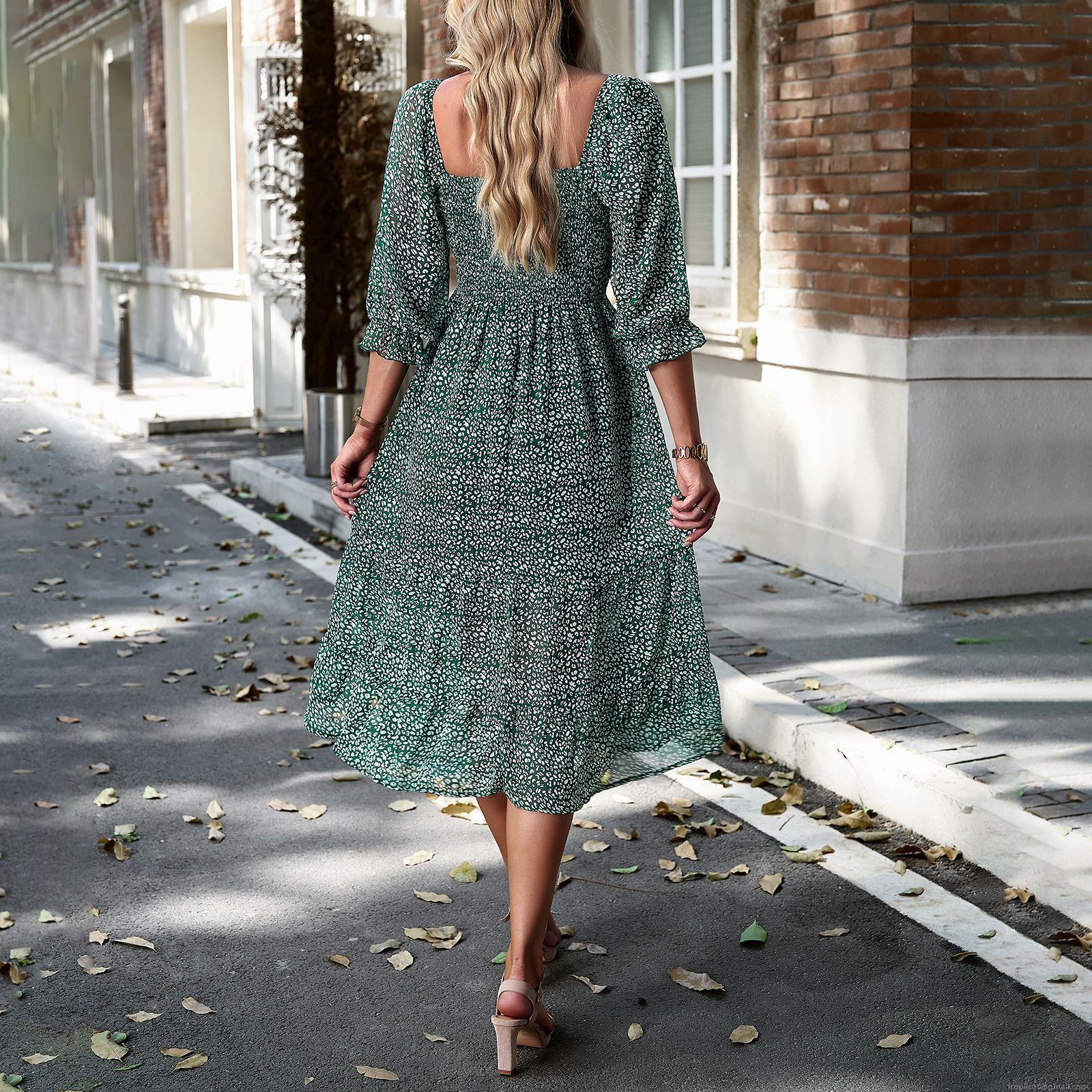 Leopard Print, Floral Pattern, Ruffles, Side Fork, Square Collar, Cake Skirt, Lantern Sleeve, Gathering And Tufting