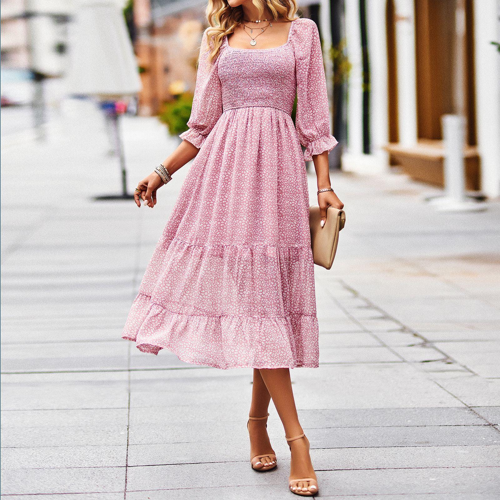 • Women's Floral Leopard Print Square Neck Midi Dress Smocked Bodice 3/4 Puff Sleeve Tiered Ruffle Dress With Slit Elegant Polyester Viscose Vacation Party Long Dress