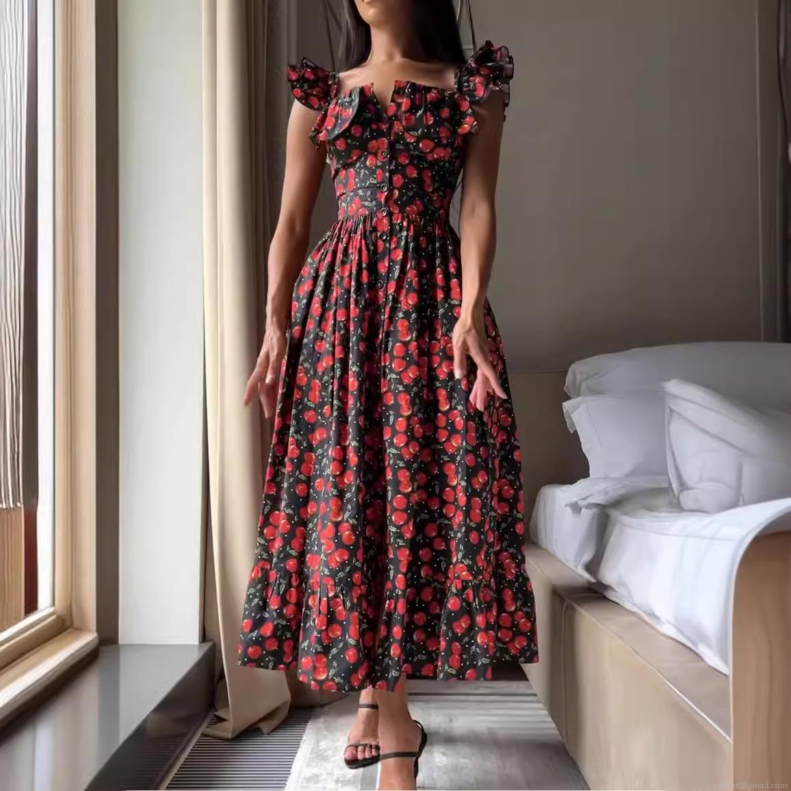 Cherry, Strawberry, Floral Pattern, Ruffles, Printing, Single-breasted