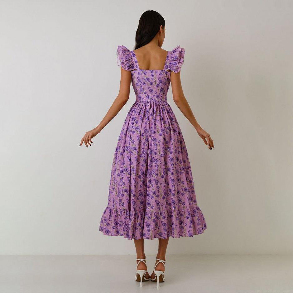 Women's Floral Print Midi Dress Flutter Sleeve Square Neck Single Breasted A-Line Summer Beach Vacation Dress
