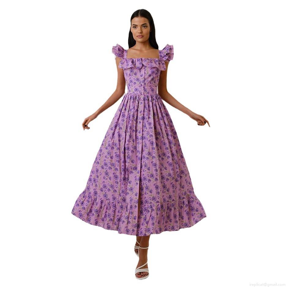• Women's Floral Print Midi Dress Flutter Sleeve Square Neck Single Breasted A-Line Summer Beach Vacation Dress