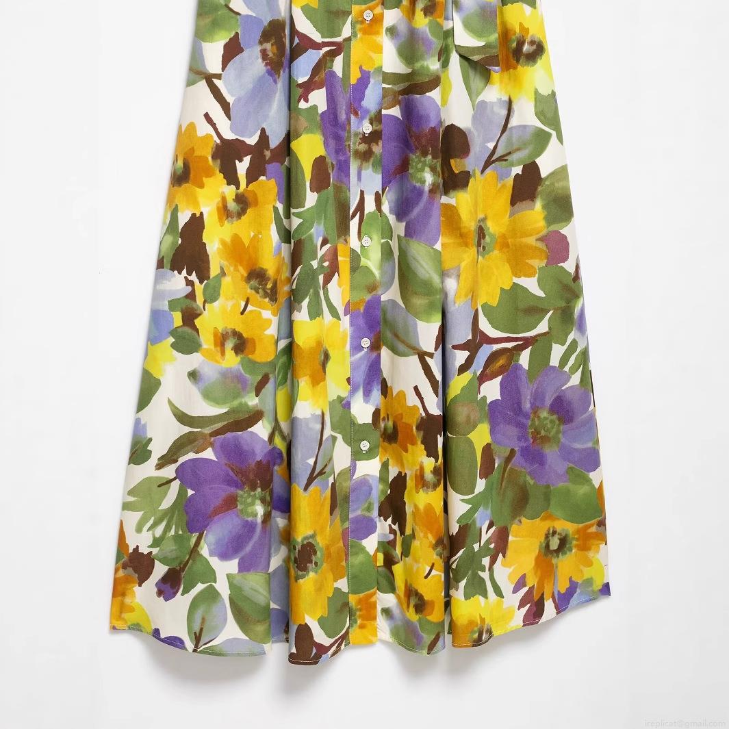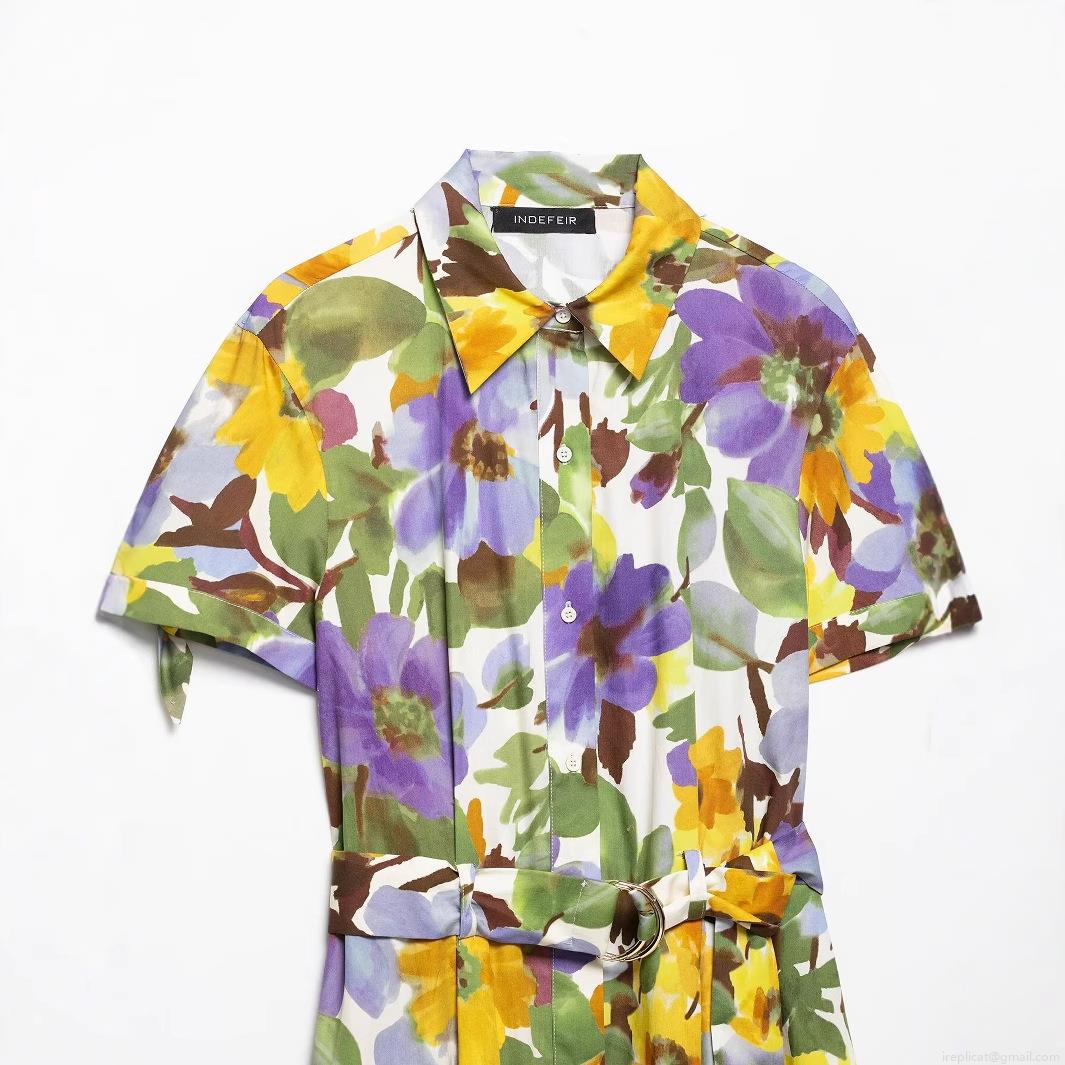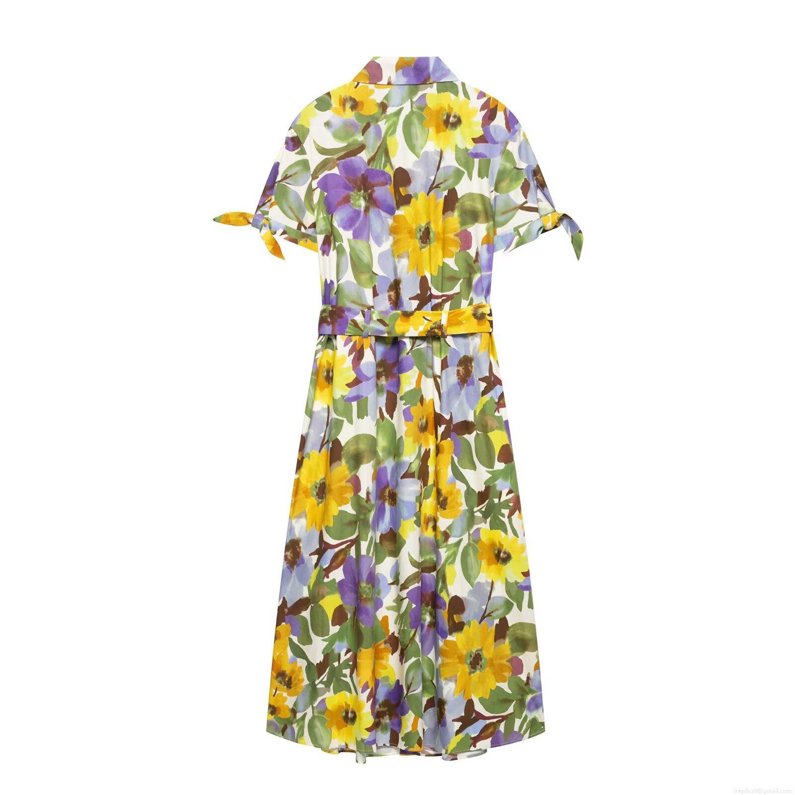 Women's Floral Print Shirt Dress Elegant Short Sleeve Button Down Midi Poplin Dress With Belt For Summer Vacation Party