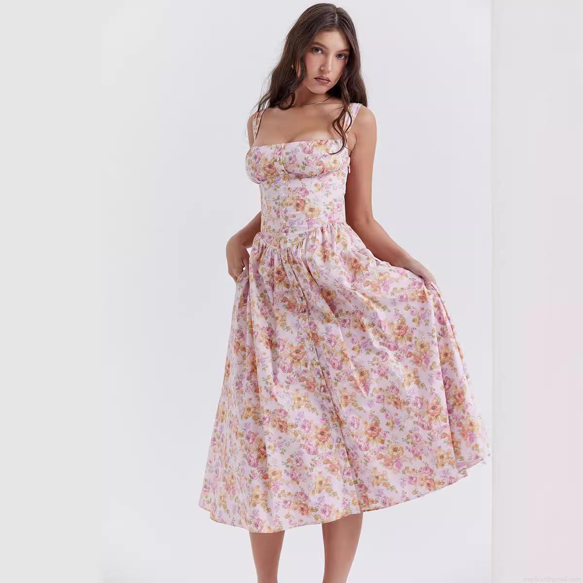 Women's Floral Print Spaghetti Strap Midi Dress Sexy A-Line Vacation Sun Dress with Front Buttons and Pockets Polyester Spandex Summer Casual Outfits