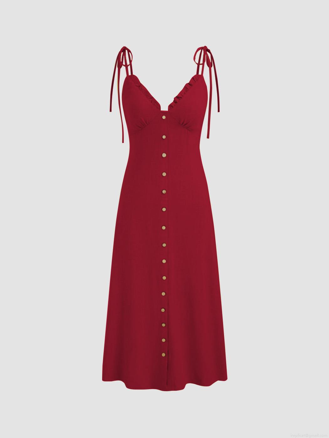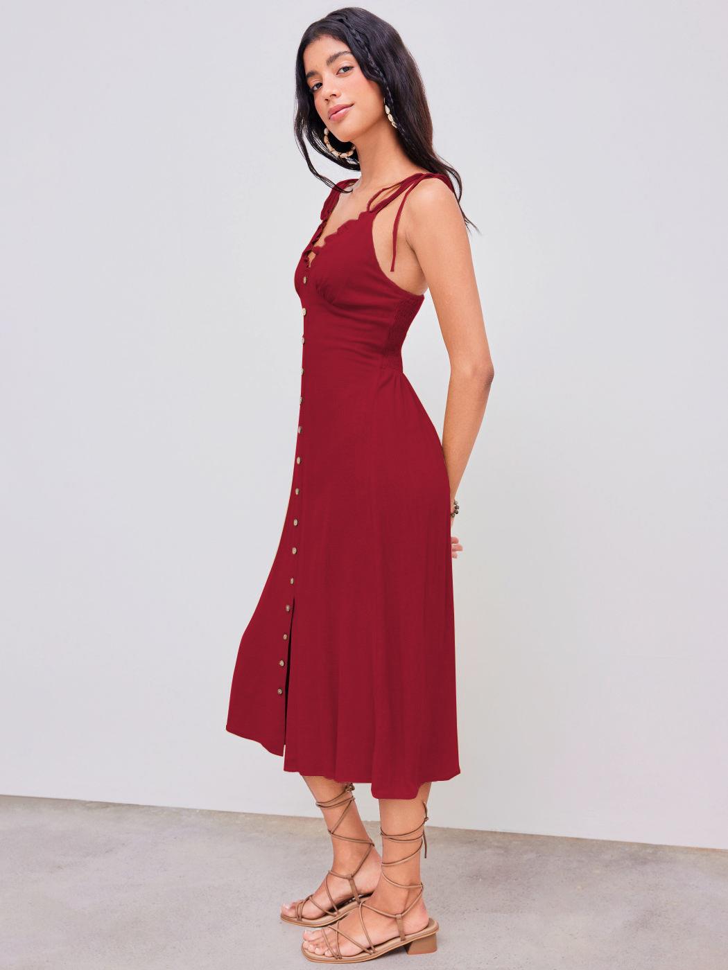 • Women's French Style 100% Cotton Midi Dress Elegant V-Neck Ruffle Trim Single Breasted Wine Red Sling Dress With Smocked Back Adjustable Tie Straps A-Line Summer Sundress