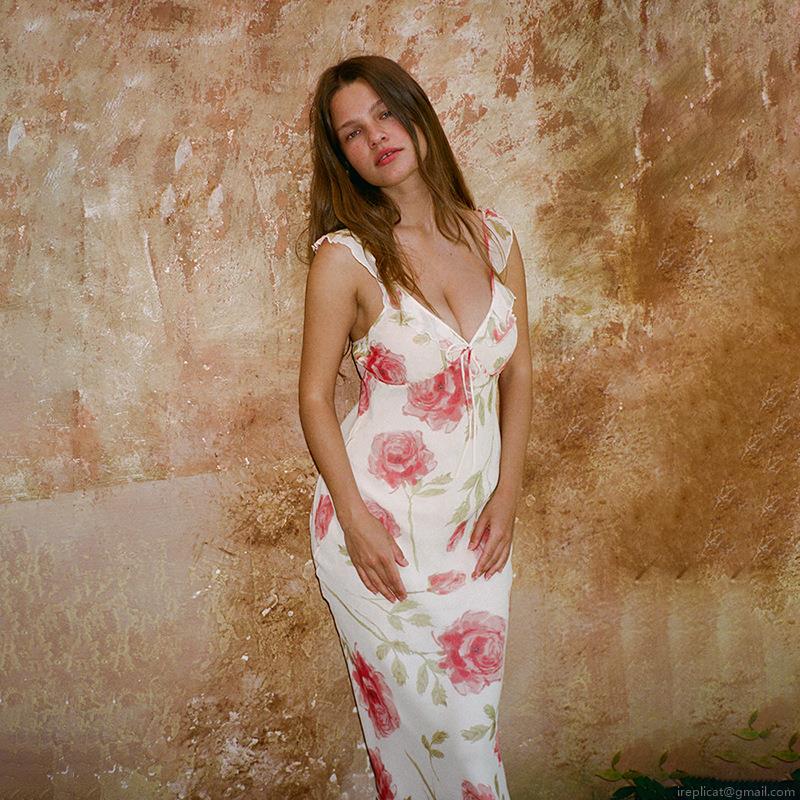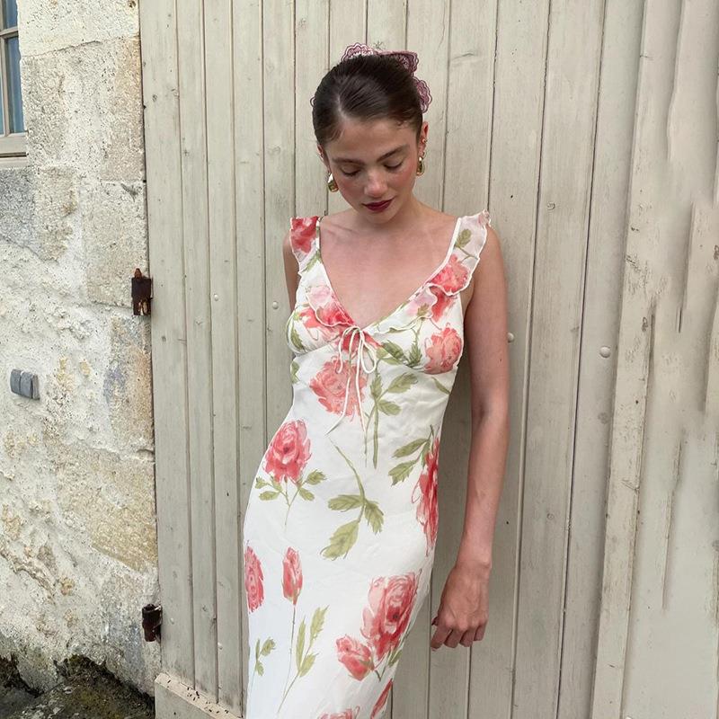 • Women's French Vintage Red Rose Floral Print Spaghetti Strap Midi Dress Sexy V Neck Ruffle Trim High Waist Bodycon Summer Vacation Slip Dress