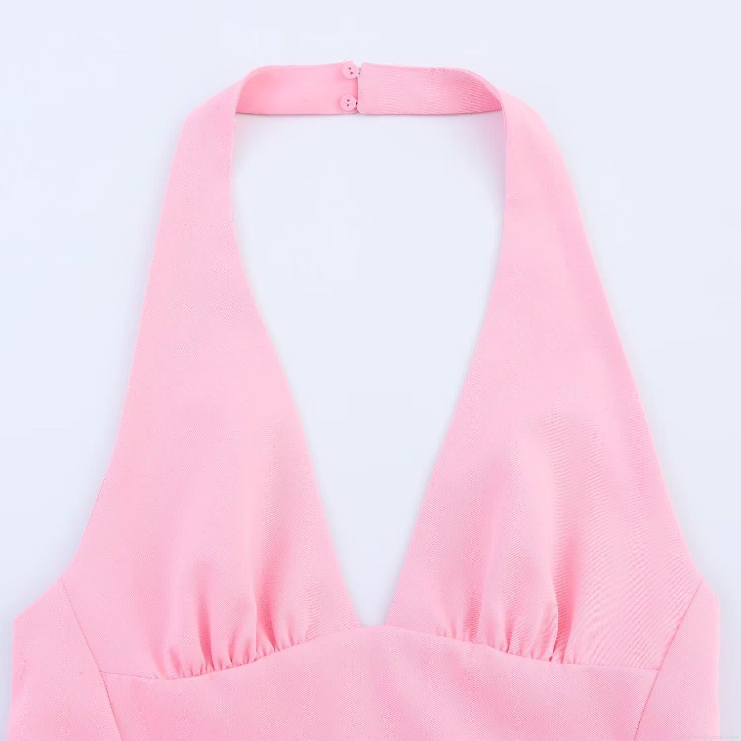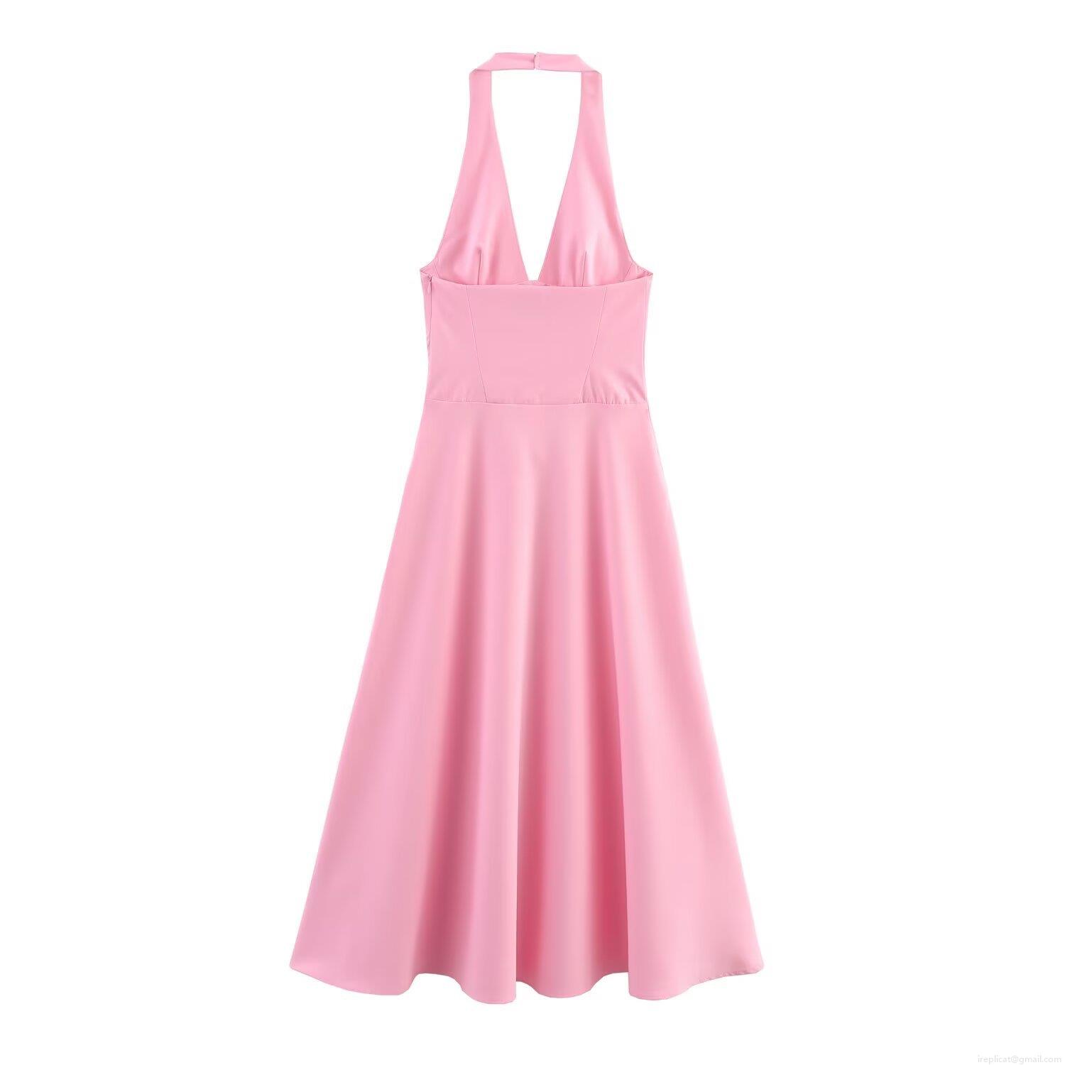 • Women's Halter Neck Backless Midi Dress Elegant V-Neck Sleeveless A-Line Polyester Party Dress Solid Pink Summer Vacation Evening Gown For Women