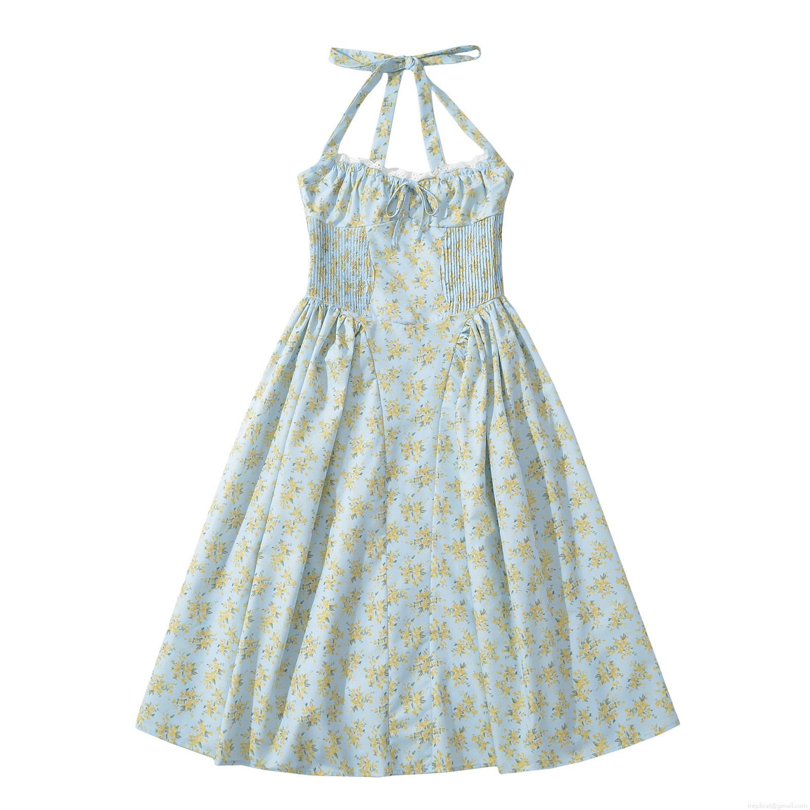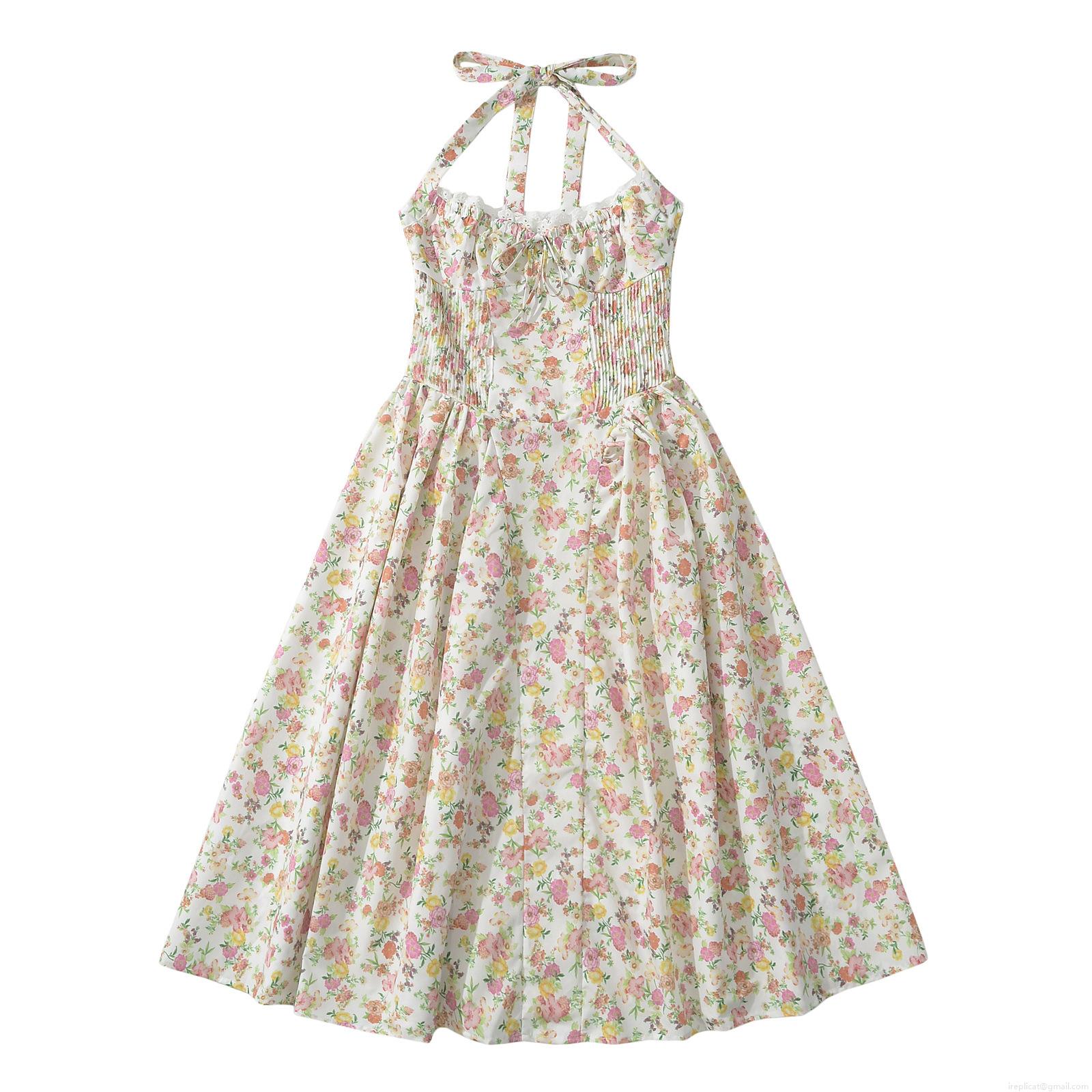 • Women's Halter Neck Floral Print Dress Elegant Smocked Waist Backless Sundress With Bow Tie Lace Trim Summer Vacation A-Line Maxi Dress