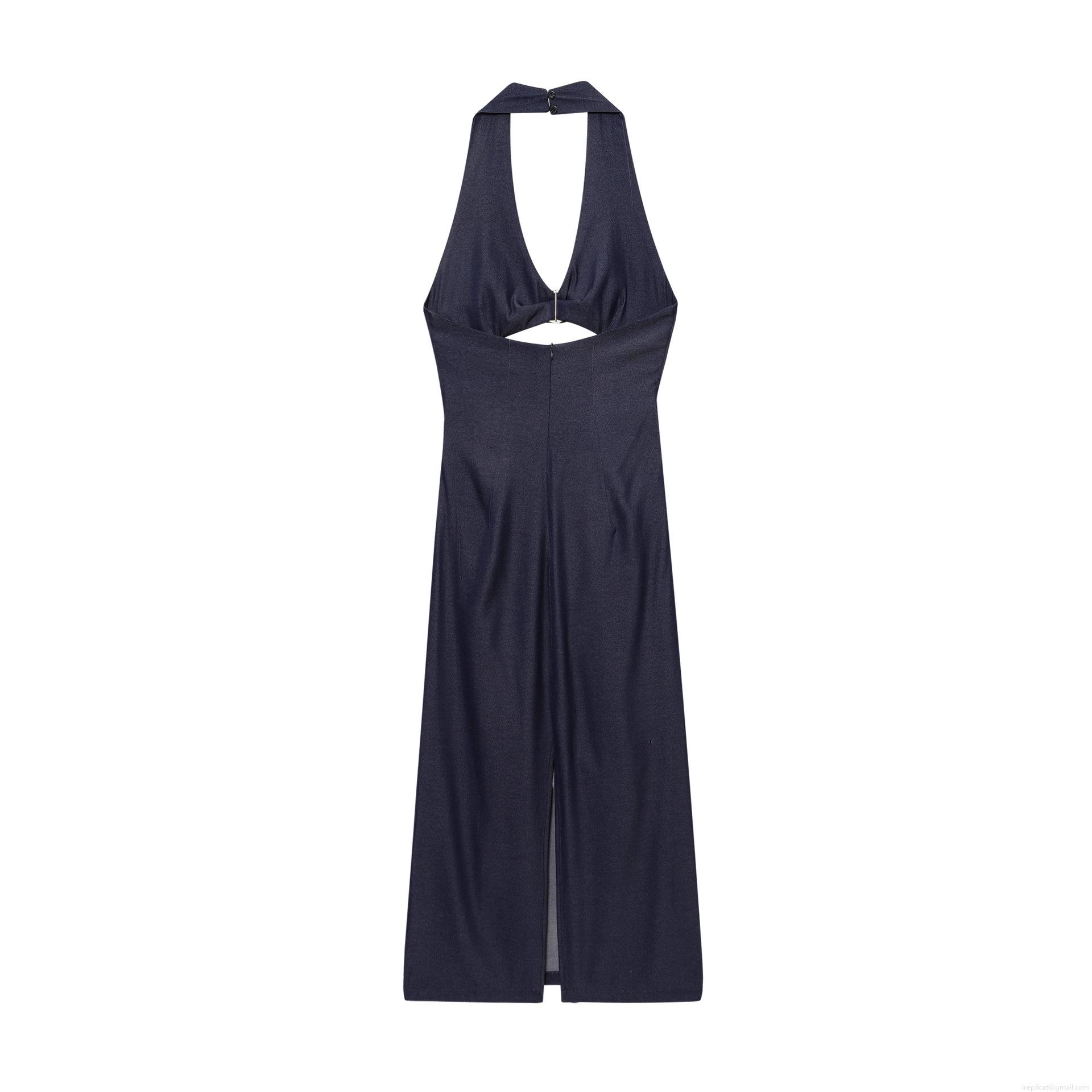 • Women's Halter Neck Midi Dress Dark Blue Polyester Ruched Waist Cutout Dress With Metal Ring Elegant Sexy Backless Slit Hem Party Dress For Women