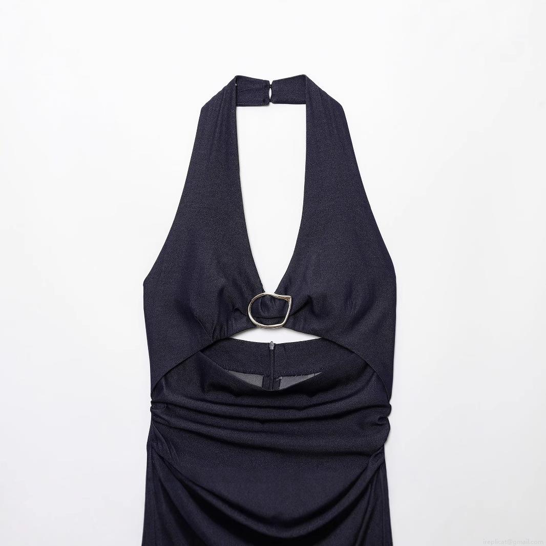 Women's Halter Neck Midi Dress Dark Blue Polyester Ruched Waist Cutout Dress With Metal Ring Elegant Sexy Backless Slit Hem Party Dress For Women