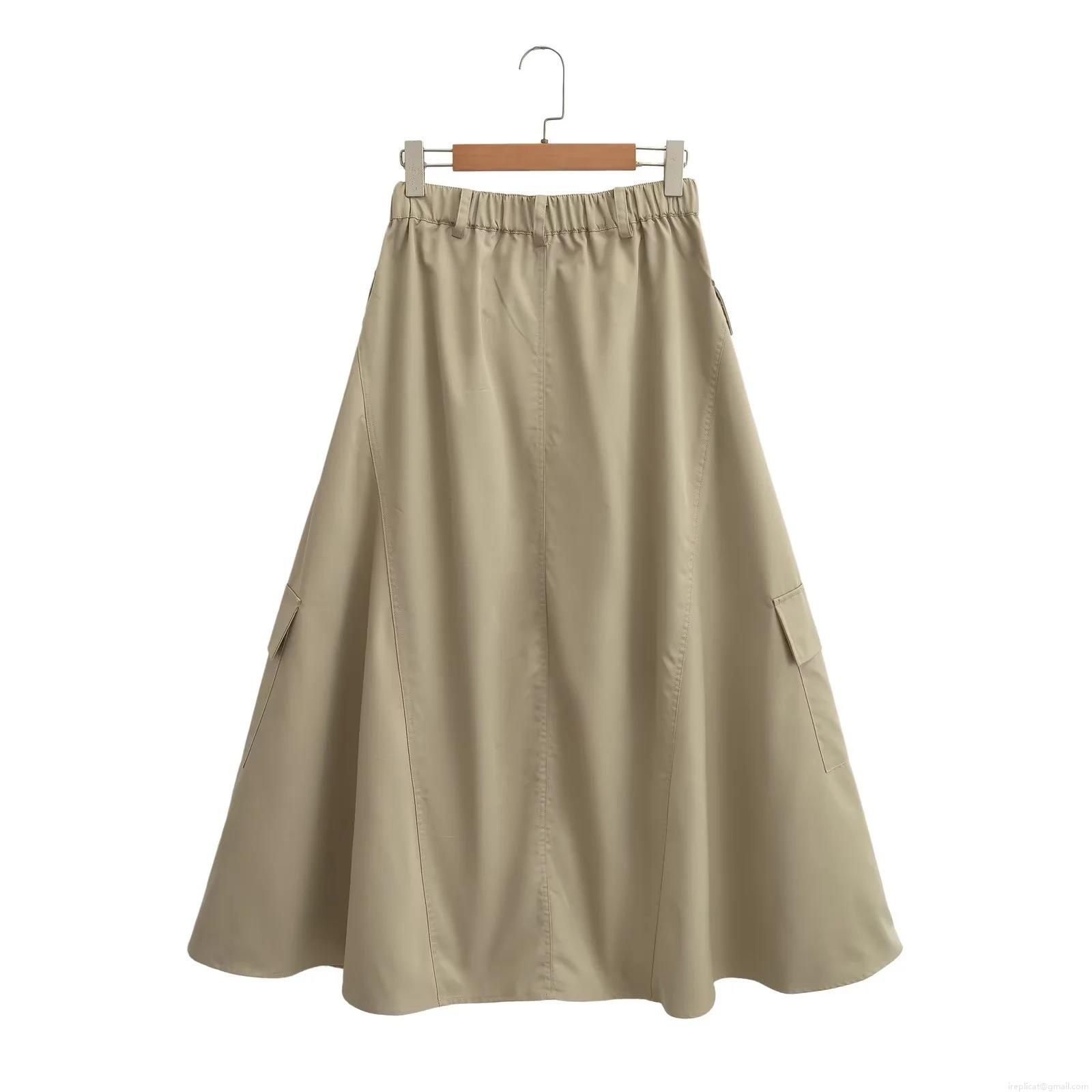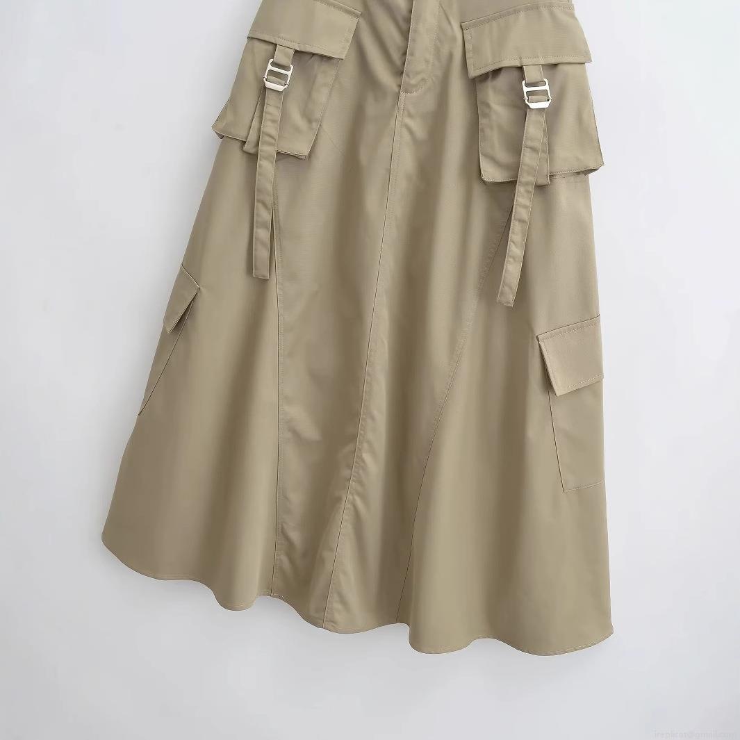 Women's High Waist Cargo Midi Skirt Khaki A-Line Workwear Skirt With Large Flap Pockets And Metal Buckles Elegant Commute Streetwear Skirt