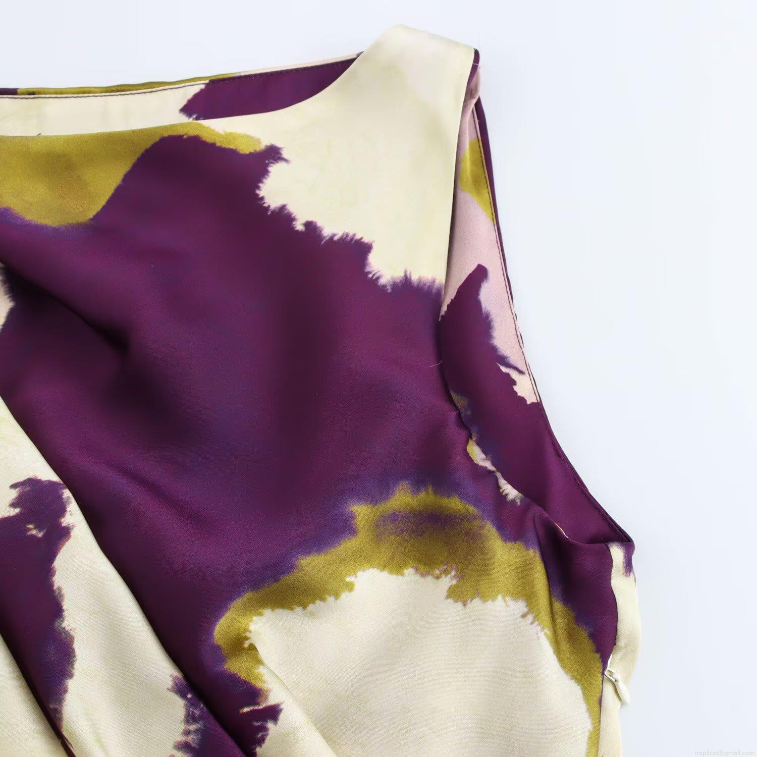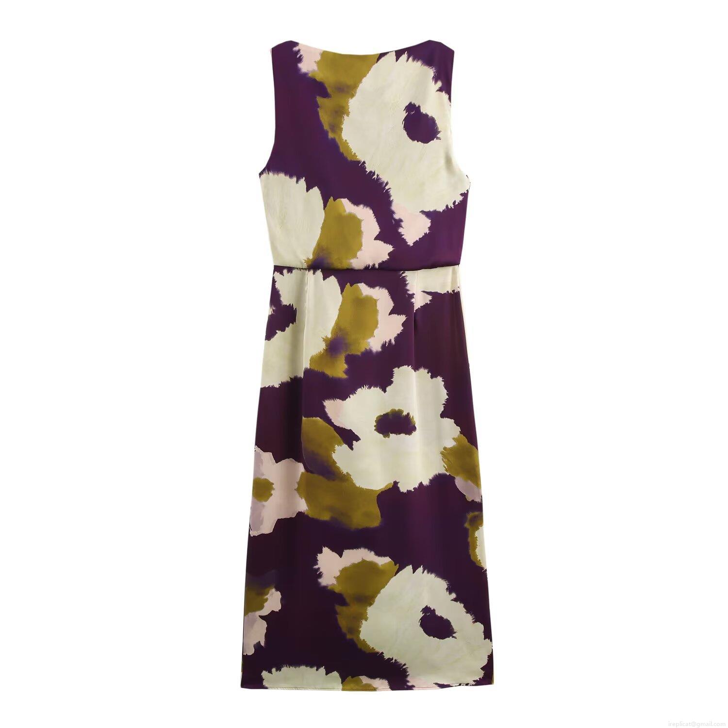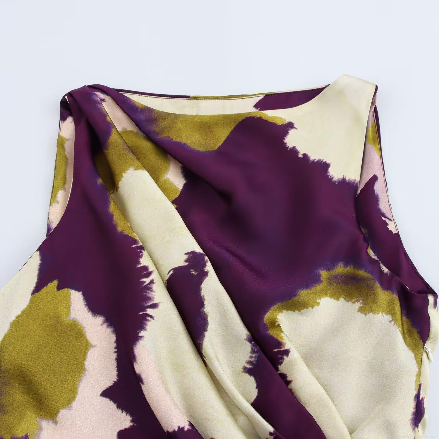 • Women's High-End Satin Abstract Floral Sleeveless Midi Dress Elegant Purple Round Neck Party A-Line Dress With Ruched Waist