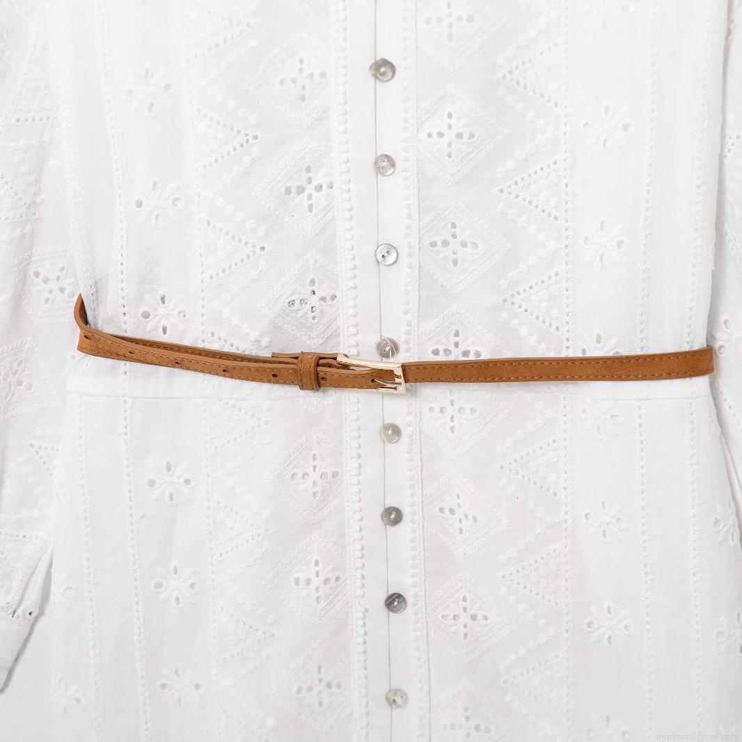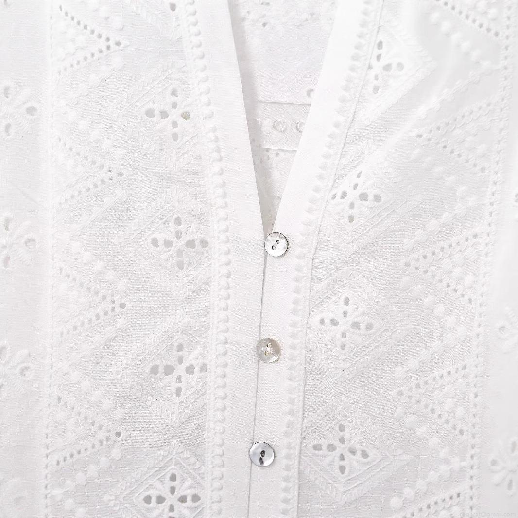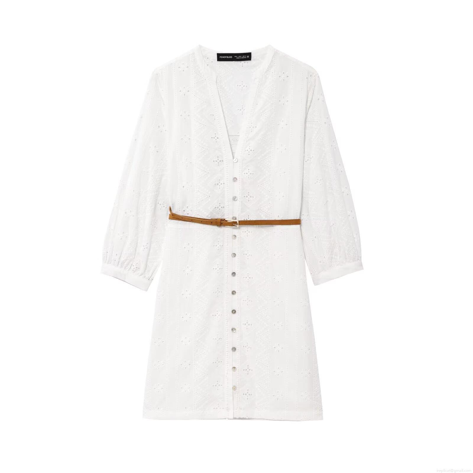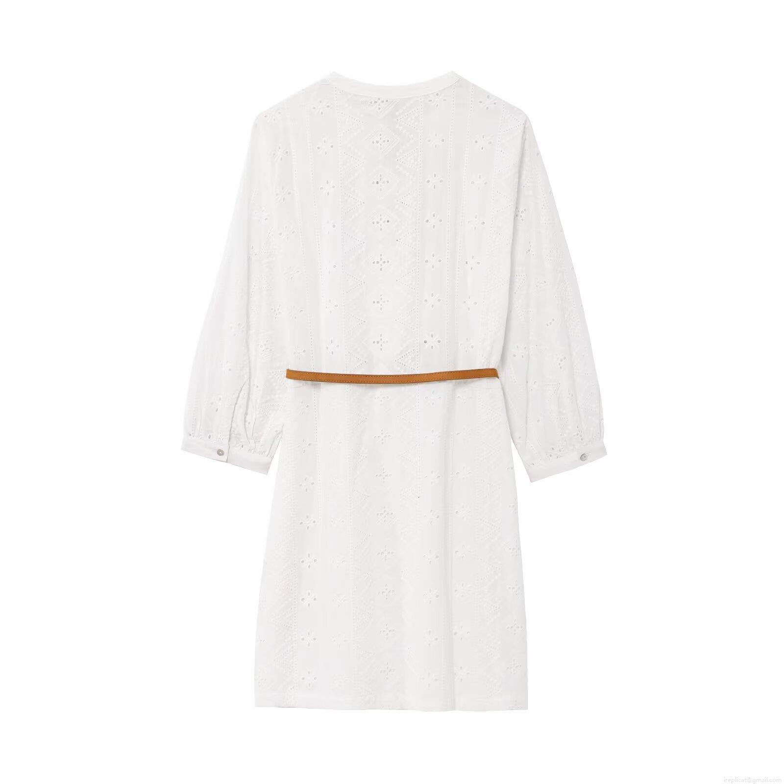 • Women's Hollow Embroidery Shirt Dress Cotton Blend Long Sleeve Midi Dress With Brown Belt European Streetwear Style Single Breasted Casual White Party Dress