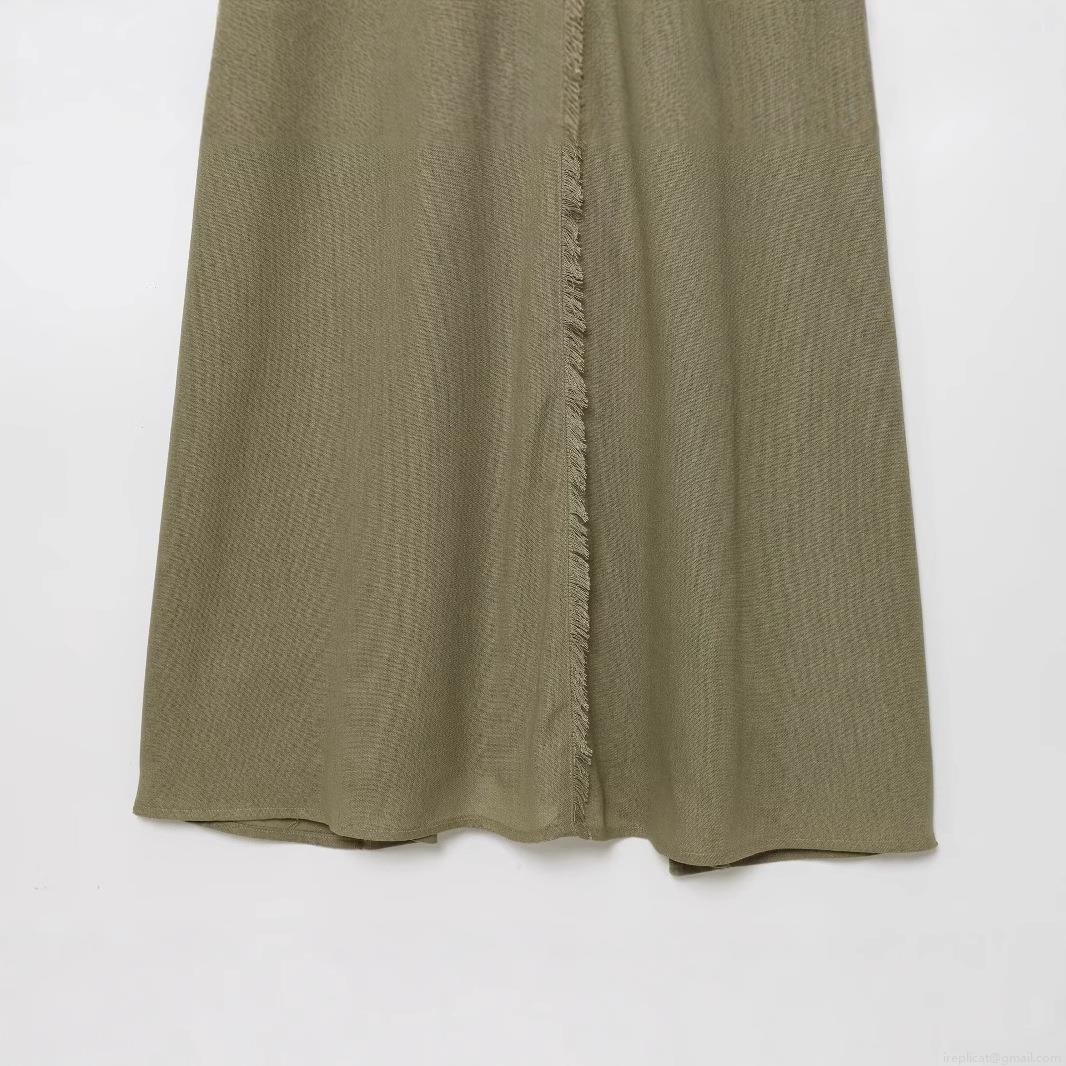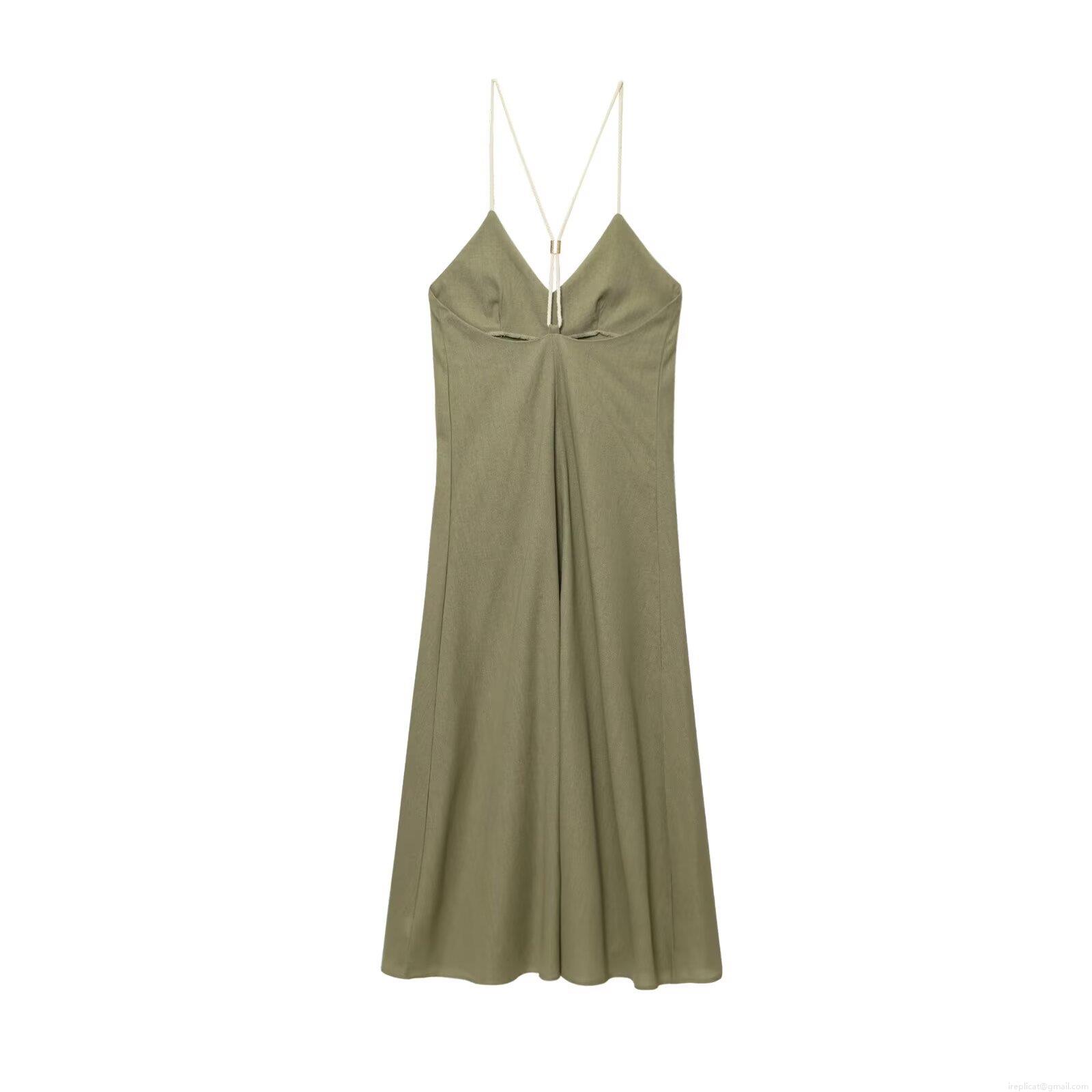 • Women's Loose Linen Blend Camisole Midi Dress V-Neck Sleeveless Fringe Detail Olive Green Casual Vacation Summer Long Dress For Women