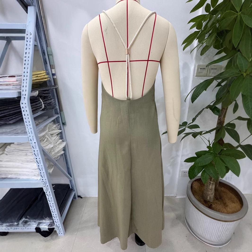 • Women's Loose Linen Blend Midi Dress V-Neck Sleeveless Cami Long Dress With Tassel Hem Detail For Summer Vacation Beach Elegant Olive Green Sun Dress