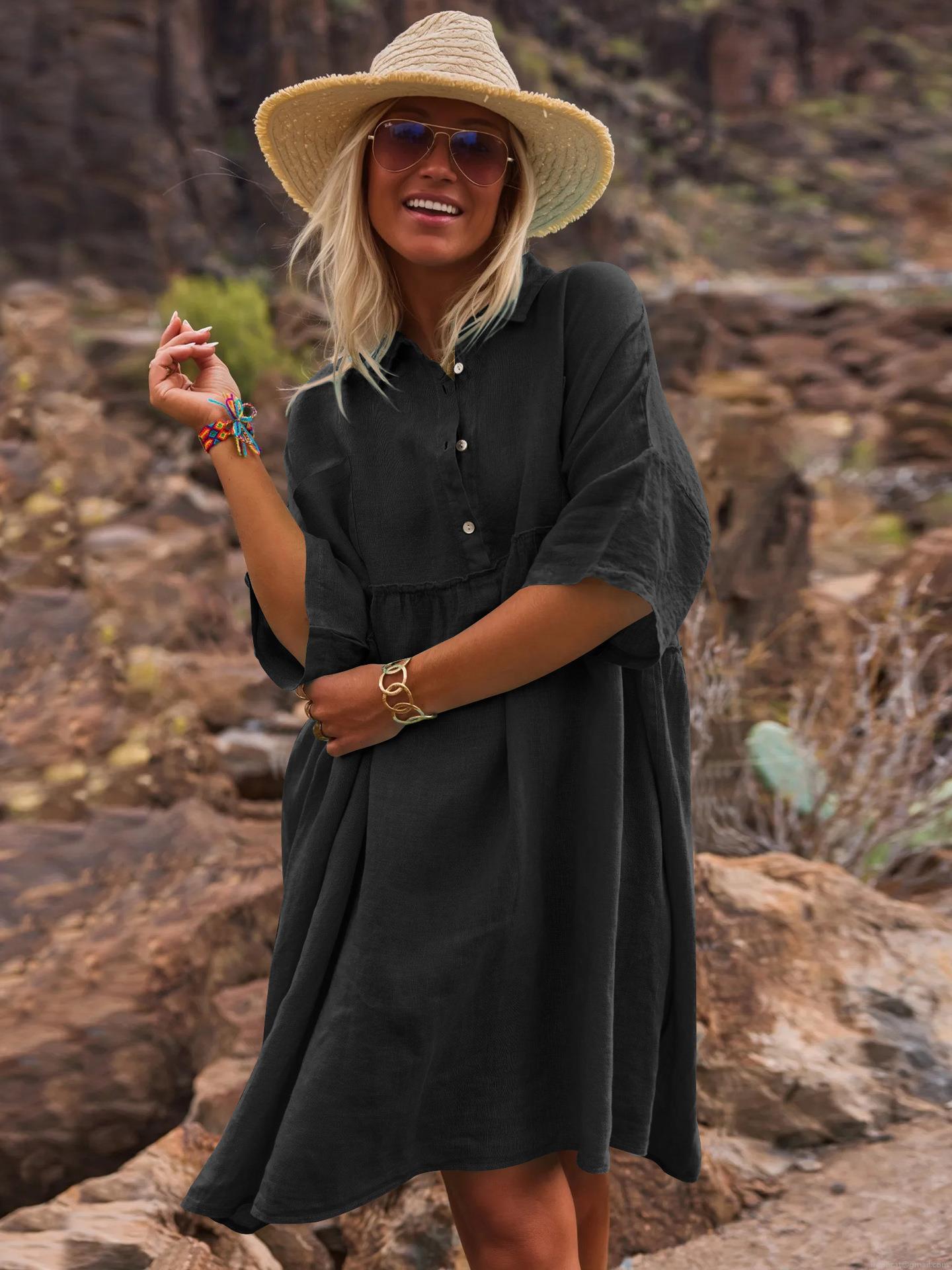 • Women's Loose Solid Color Polo Neck Shirt Dress Casual Button Up Vacation Bohemian Midi Dress Viscose Blend Short Sleeve Summer Clothing