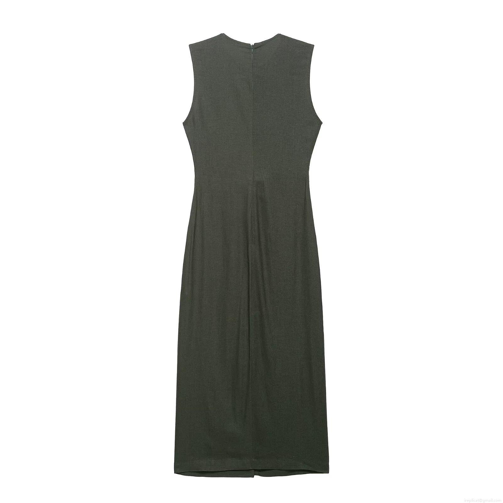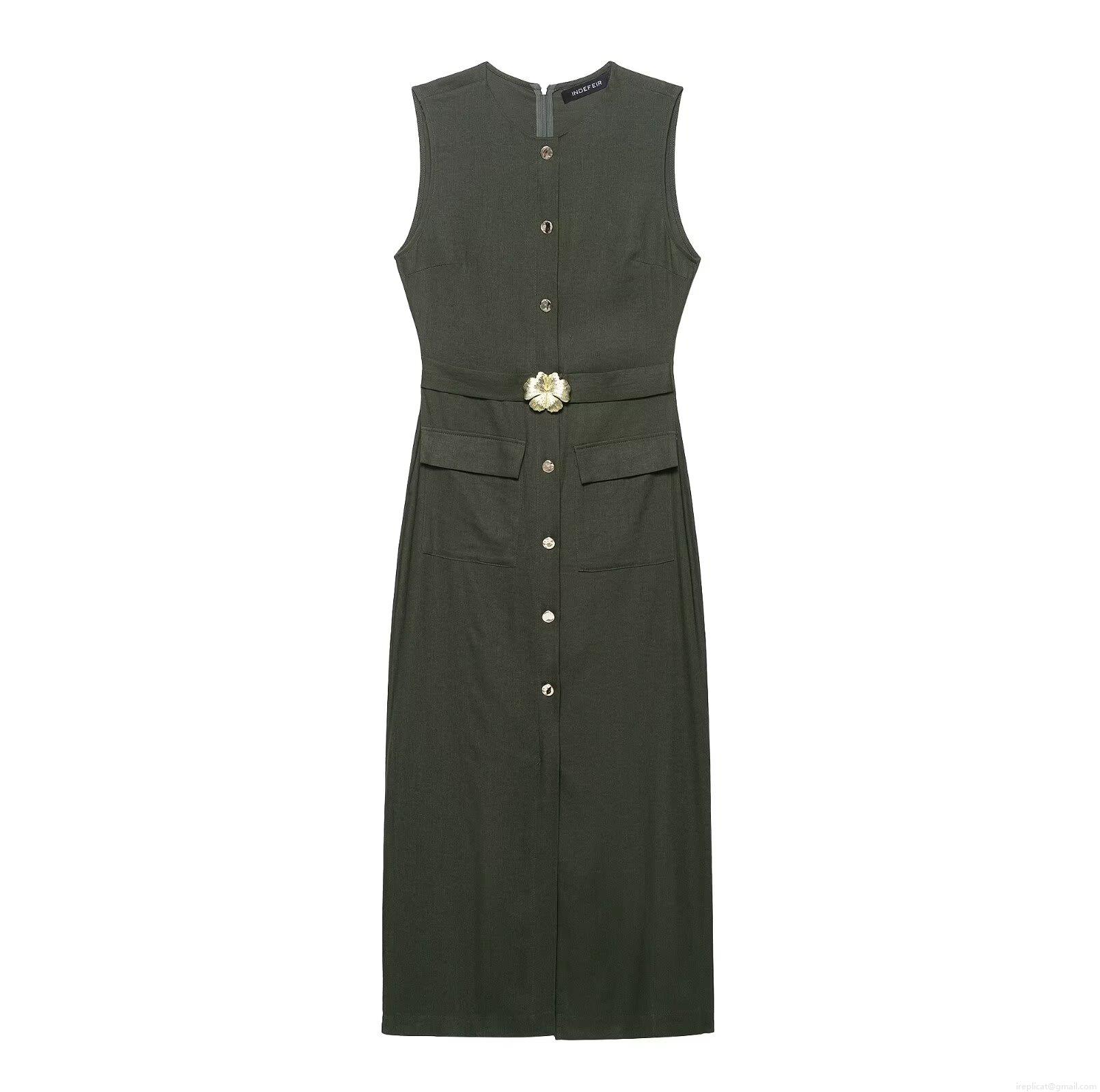 Women's Midi Dress European Sleeveless Round Neck With Golden Flower Belt Pockets Solid Color Polyester Blend Elegant Autumn Vest Dress For Women