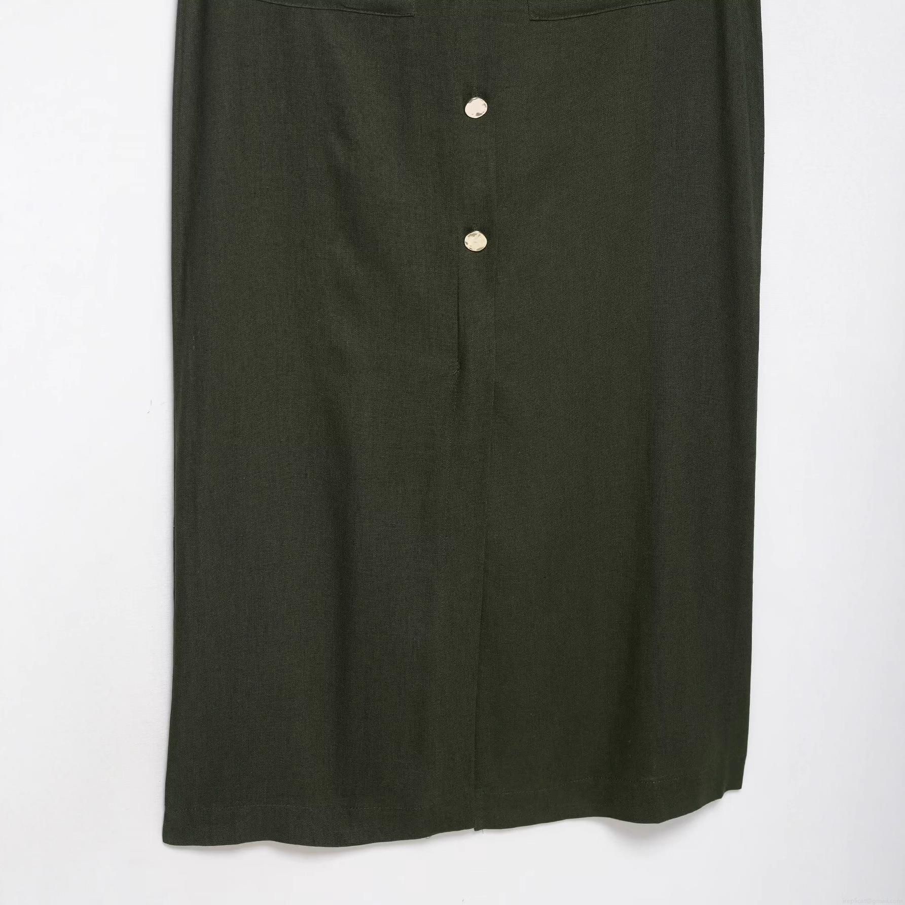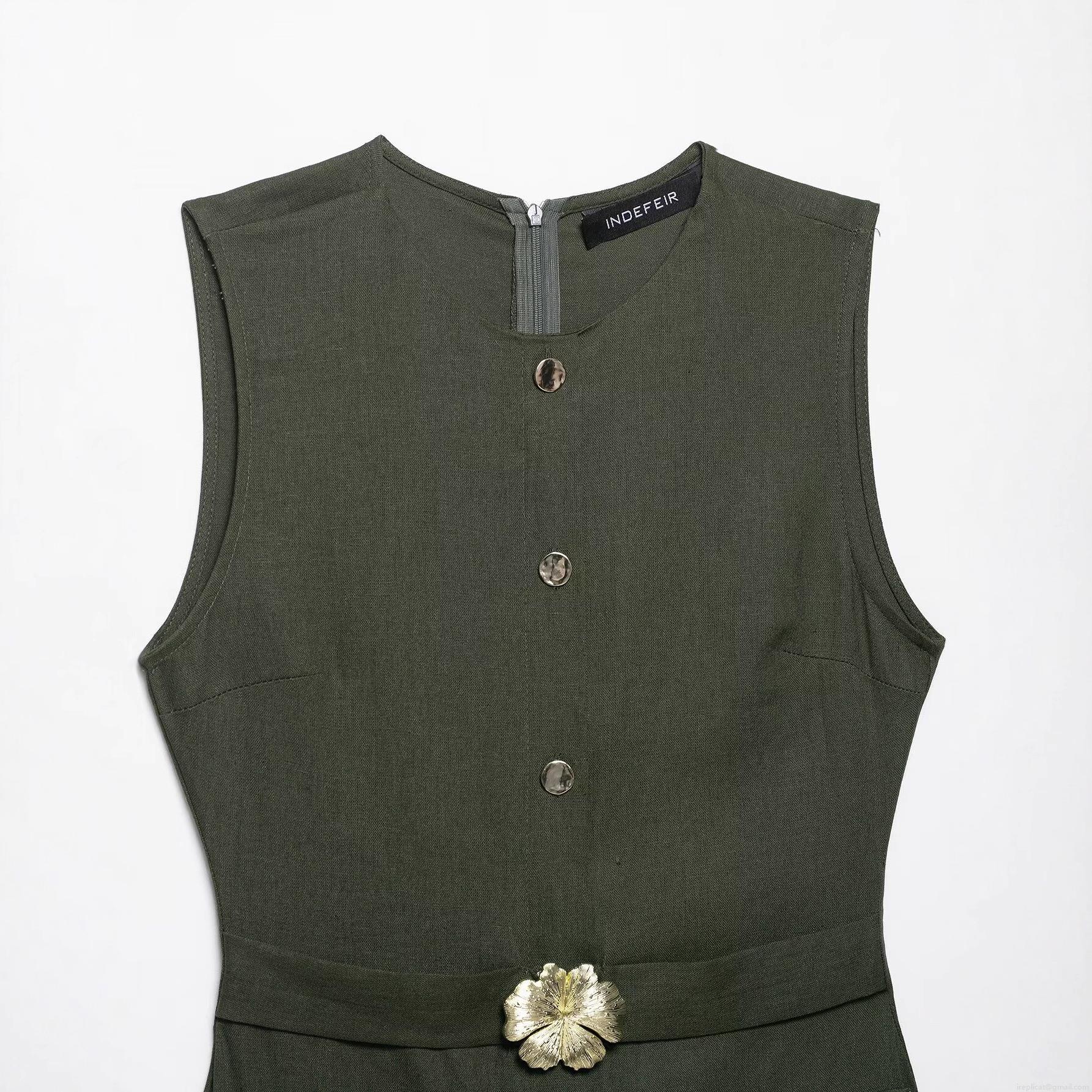 • Women's Midi Dress European Sleeveless Round Neck With Golden Flower Belt Pockets Solid Color Polyester Blend Elegant Autumn Vest Dress For Women