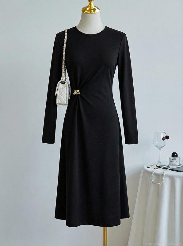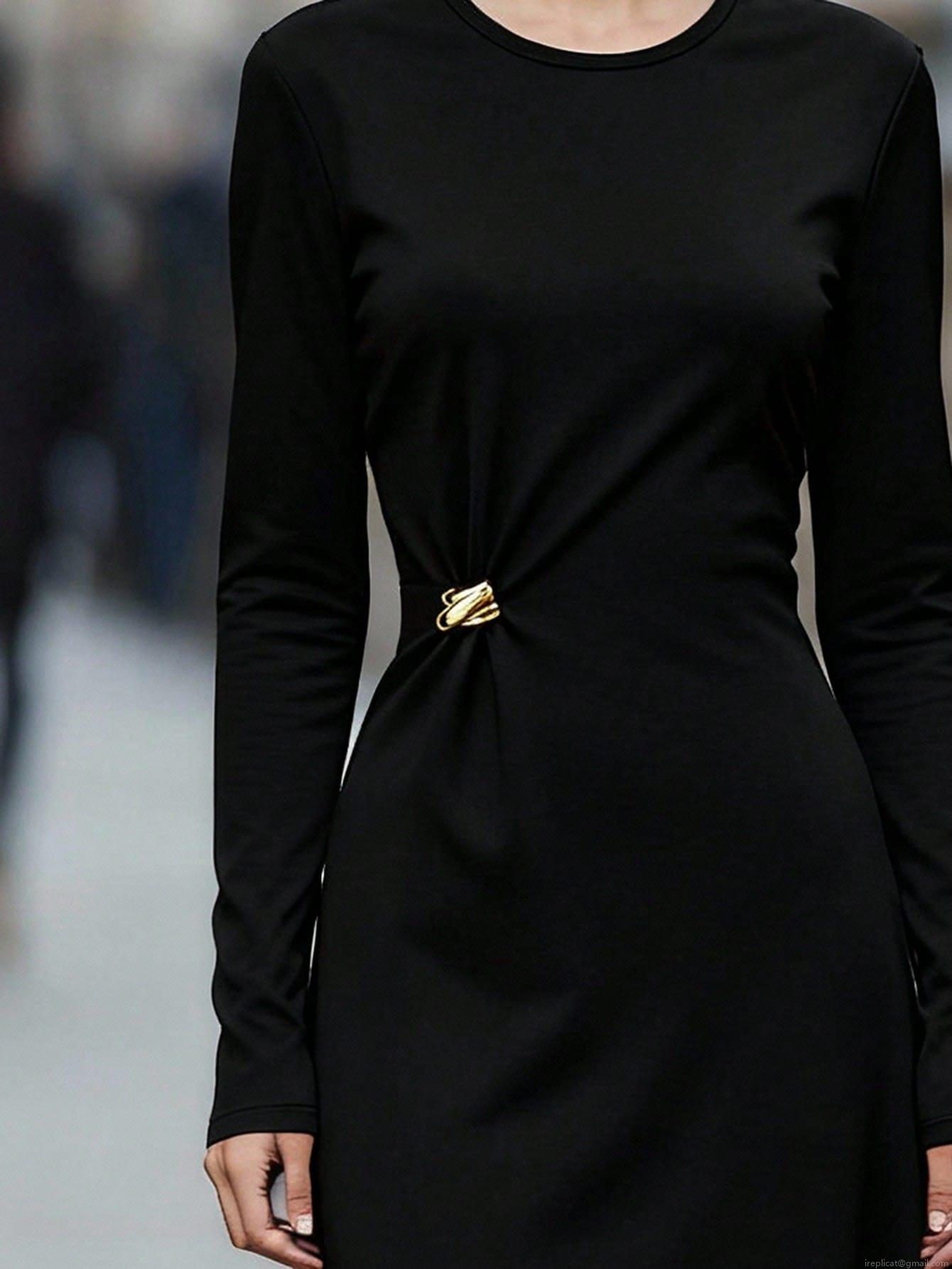 • Women's Minimalist Black Long Sleeve Bodycon Midi Dress with Gold Metal Buckle Elegant Slim Fit Autumn Winter Polyester Dress for Office Dating Lady