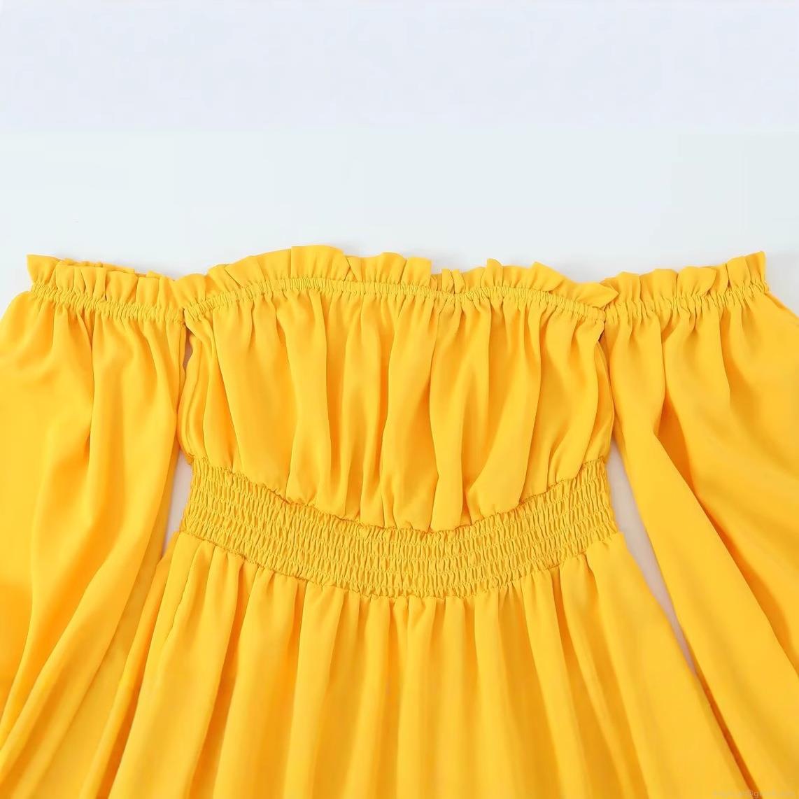 • Women's Off-Shoulder Long Sleeve Tiered Midi Dress Yellow Polyester Smocked Waist Ruffle Party Dress For Women Elegant Sexy Slit Evening Dresses
