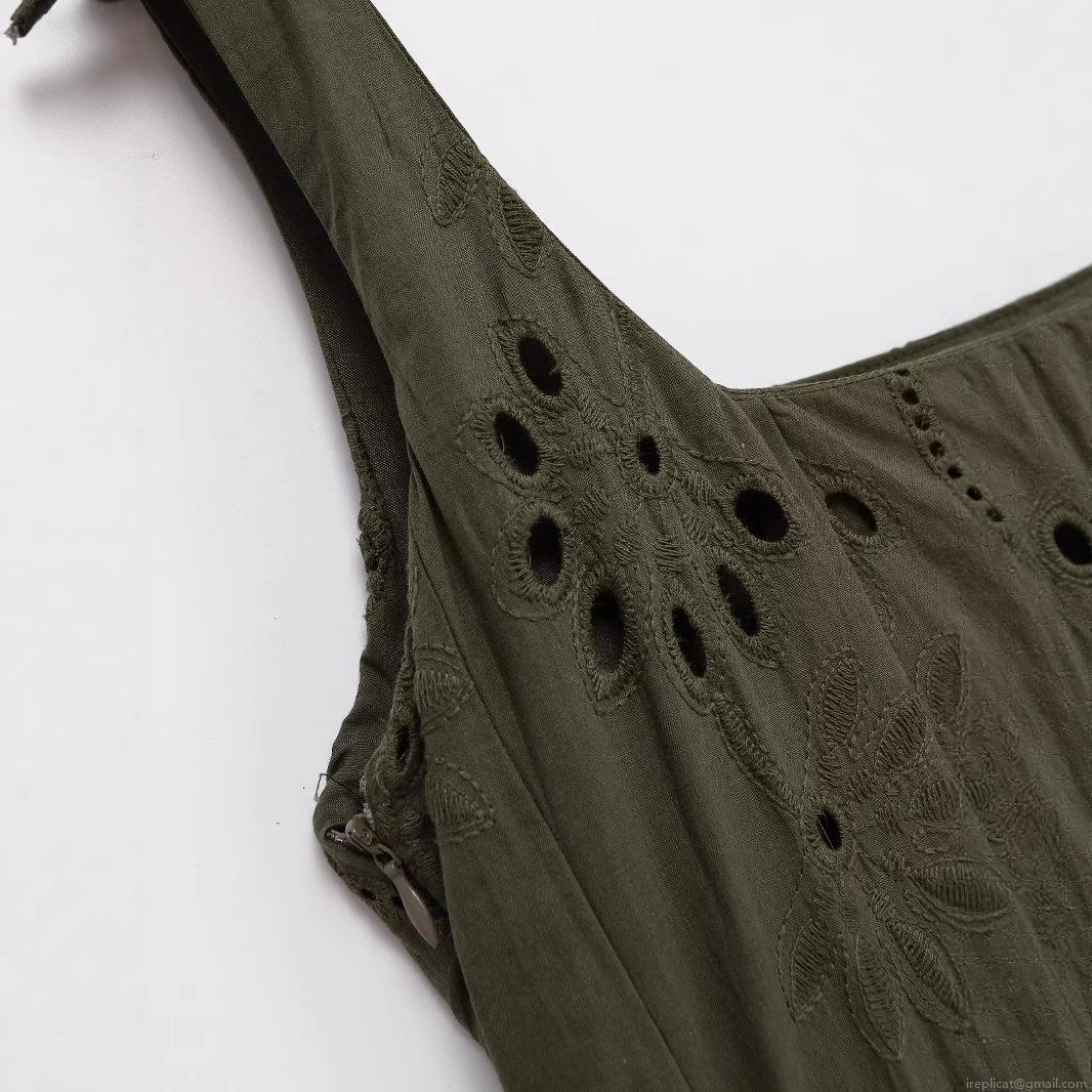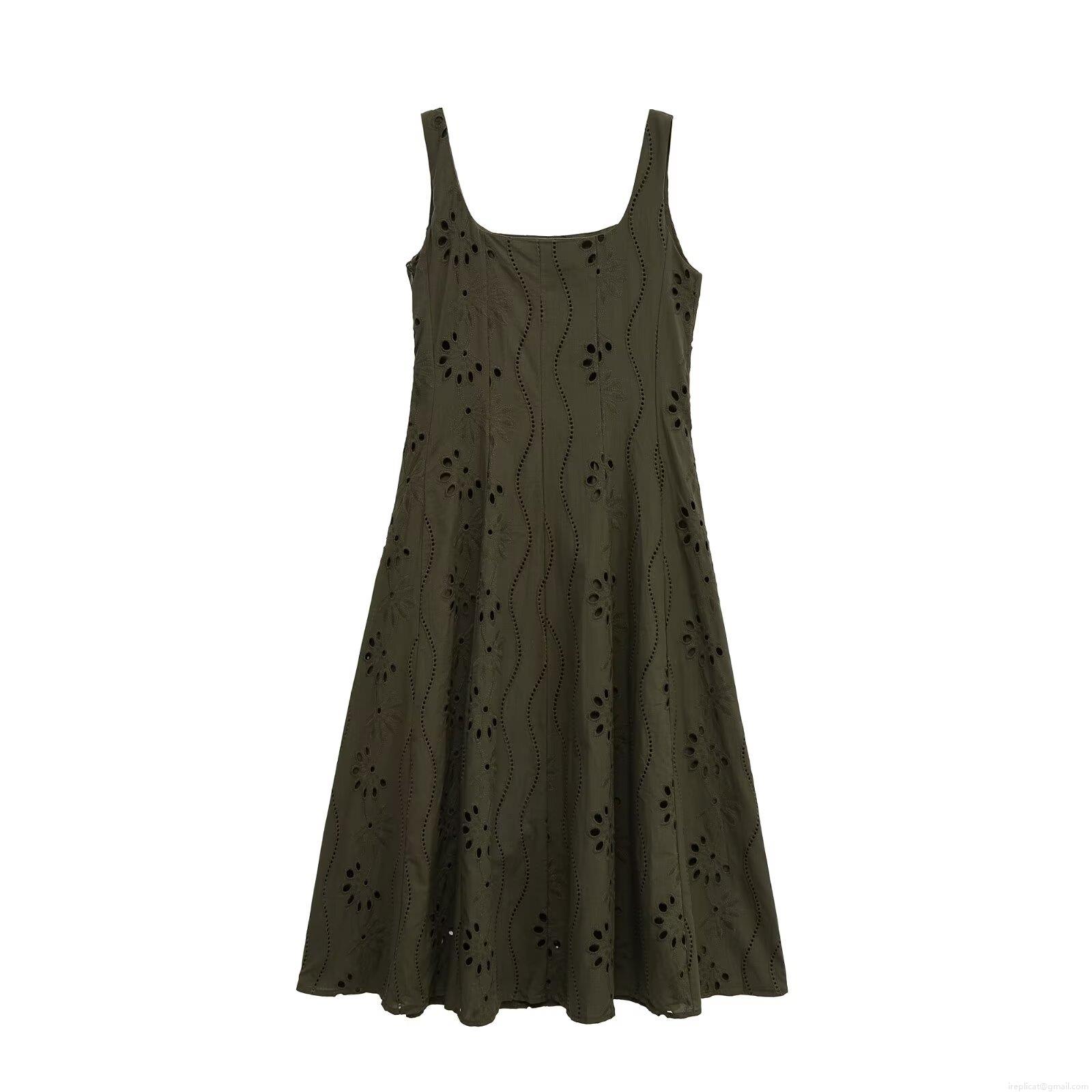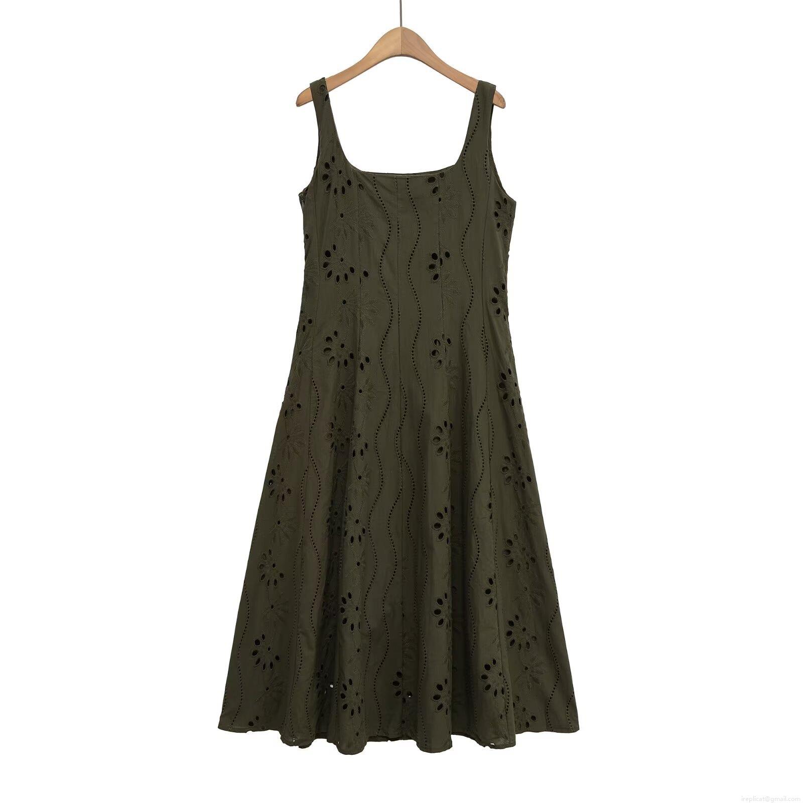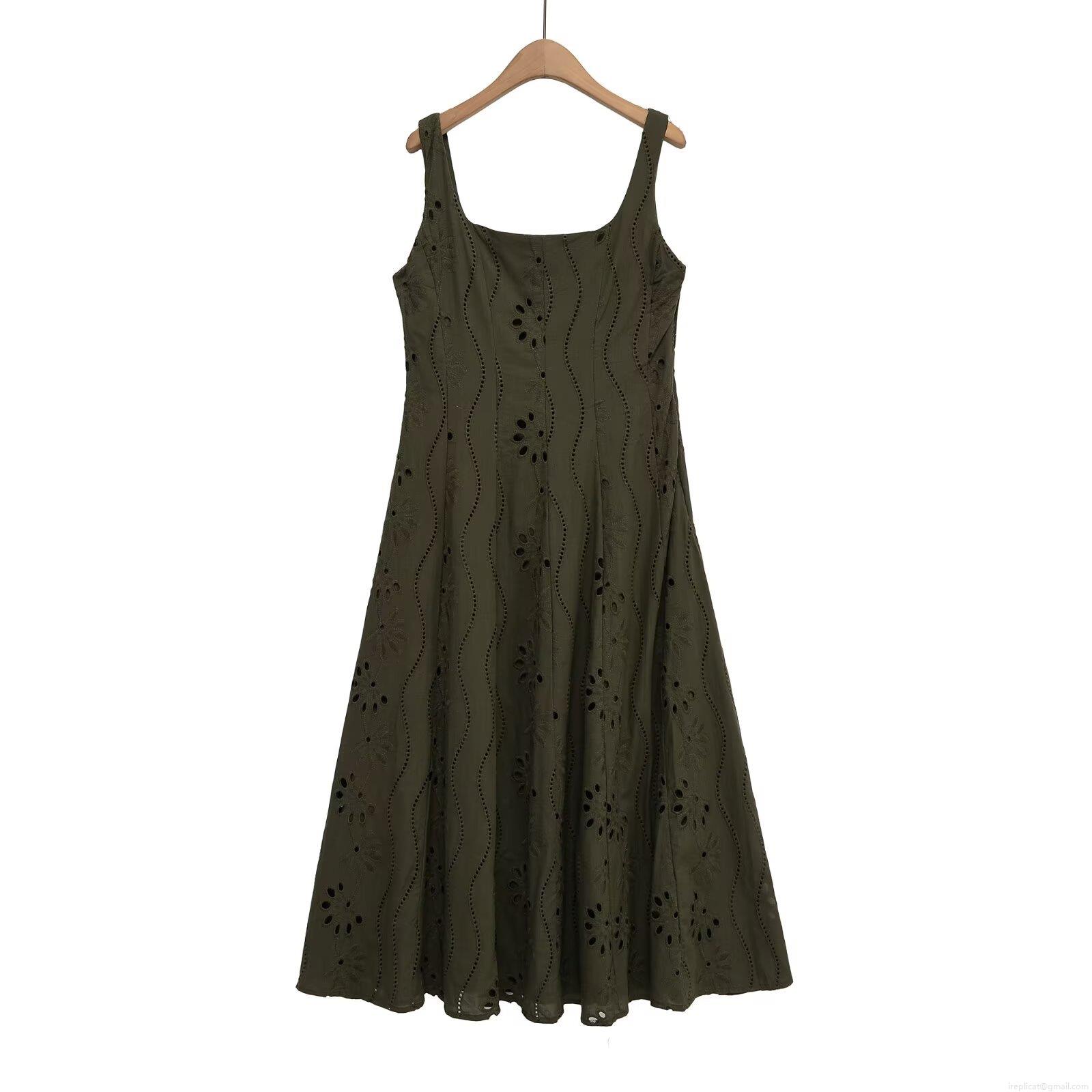 • Women's Olive Green Polyester Hollow Embroidery Lace Square Neck Wide Strap Midi Dress Elegant Sleeveless A-Line Camisole Dress For Summer Vacation