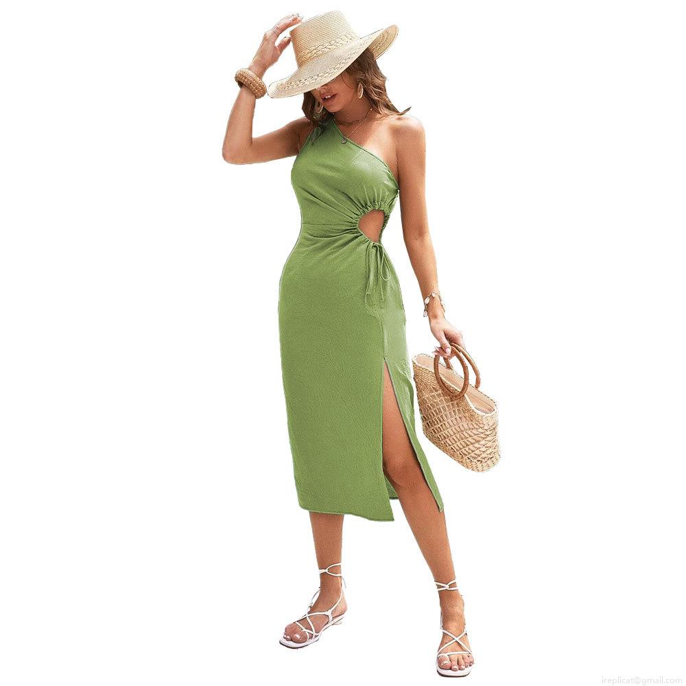 • Women's One Shoulder Cut Out Slit A-Line Dress 100% Cotton Solid Color Midi Vacation Beach Sundress for Women Elegant Summer Dress