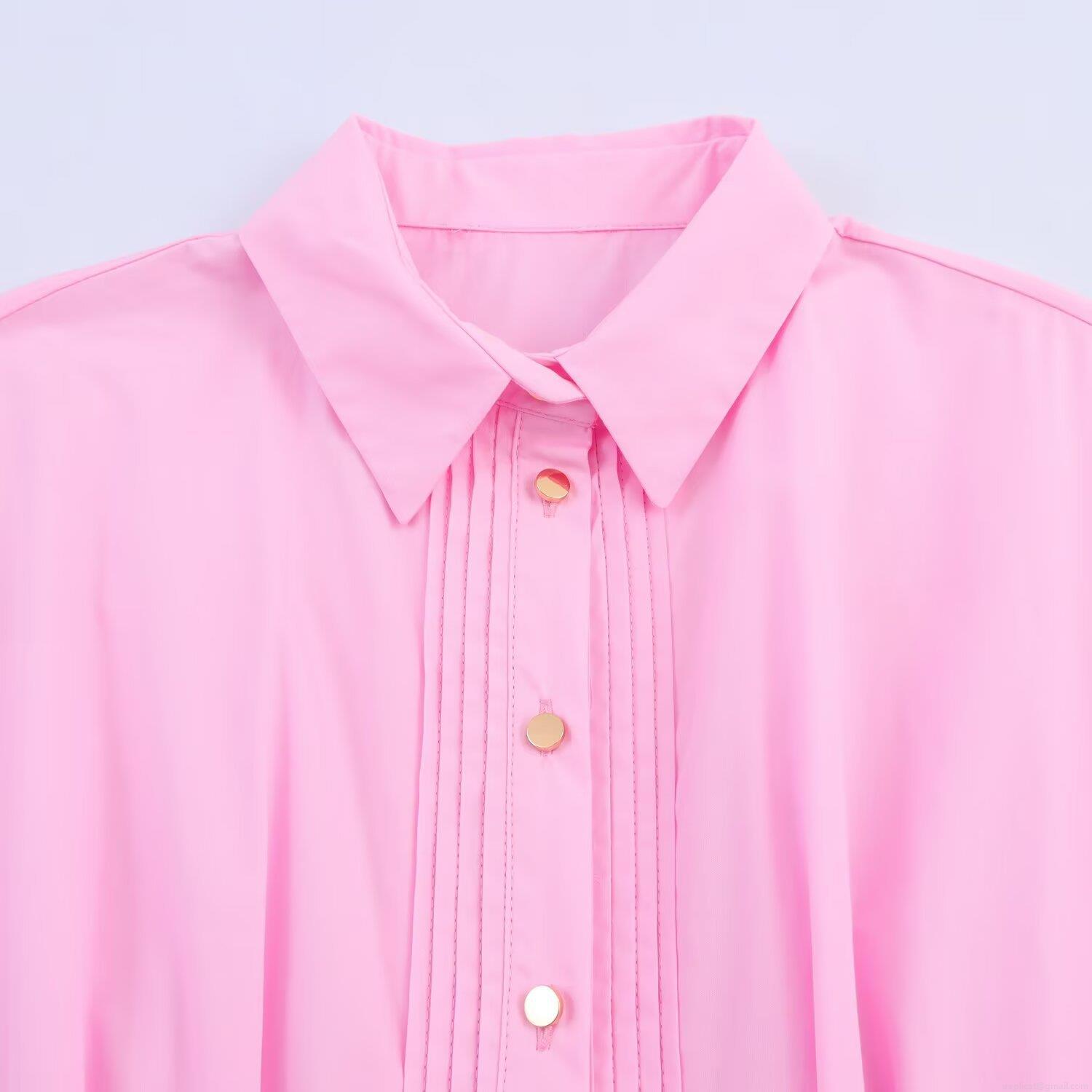 Women's Pink Poplin Midi Shirt Dress With Belt Elegant Short Sleeve Pleated Design Button Down Summer Casual Office Lady Party Dress