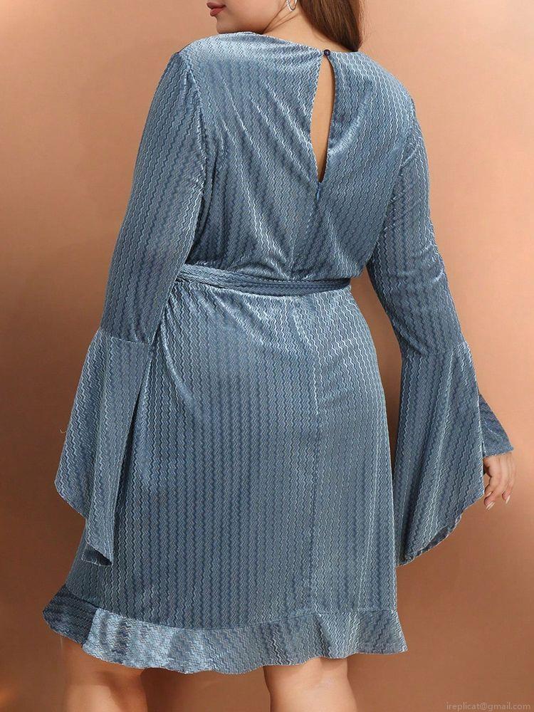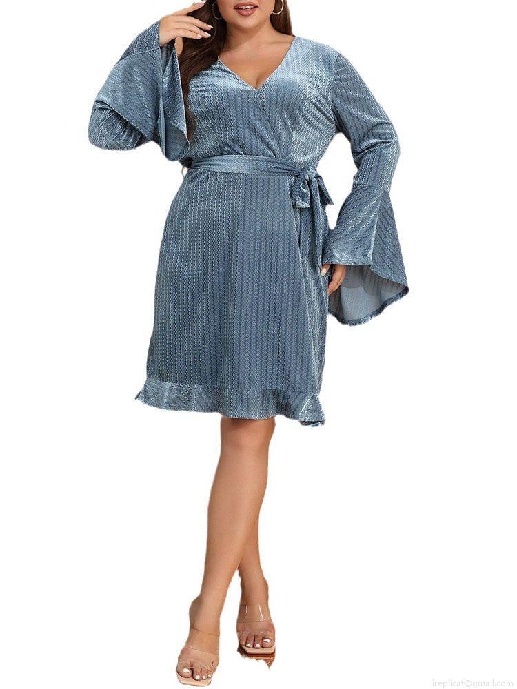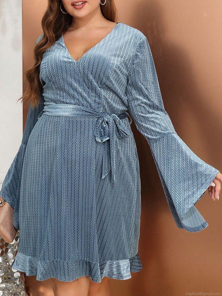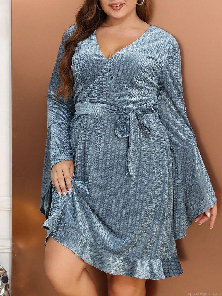 • Women's Plus Size Midi Dress Elegant V-Neck Flare Long Sleeve Tie Waist Ruffle Hem Wavy Textured Polyester Spandex Dress For Party Evening Autumn Dusty Blue