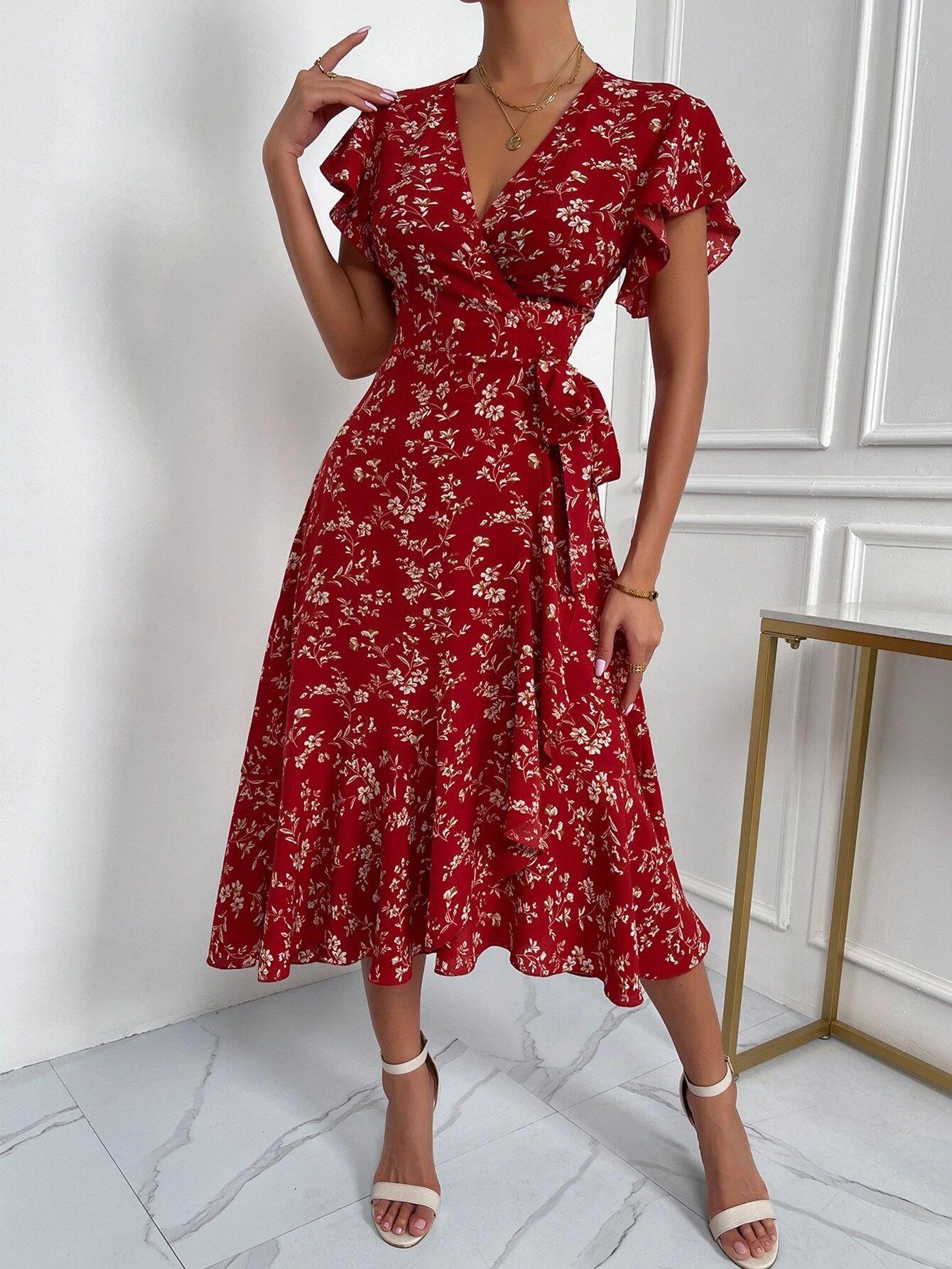 • Women's Red Floral Print V-Neck Wrap Midi Dress With Ruffle Sleeves And Tie Waist Summer Vacation Bohemian A-Line Long Dress For Ladies