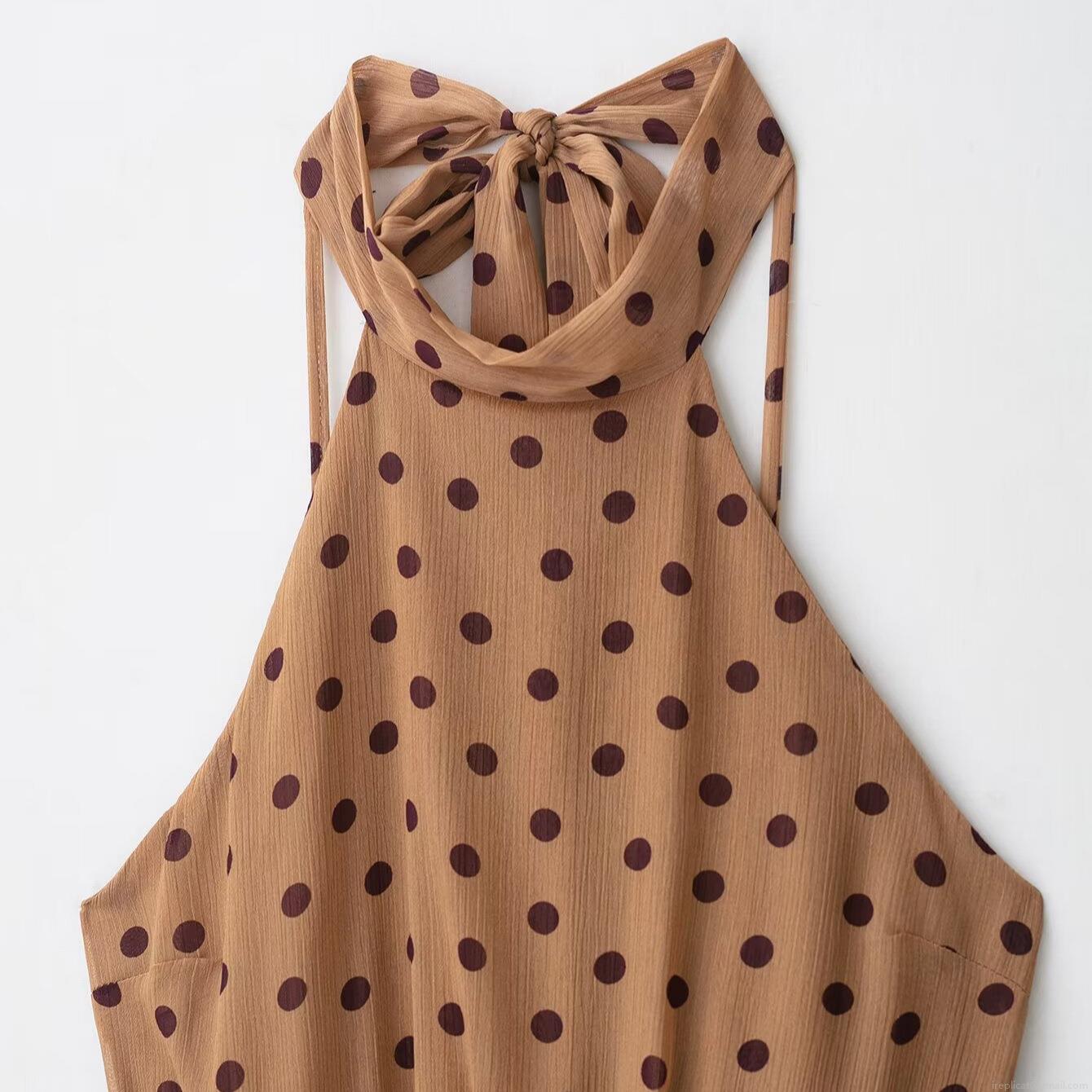 Women's Retro Halter Neck Polka Dot Pleated Midi Dress With Faux Leather Belt Chiffon Sleeveless A-Line Elegant Party Dress For Summer Autumn