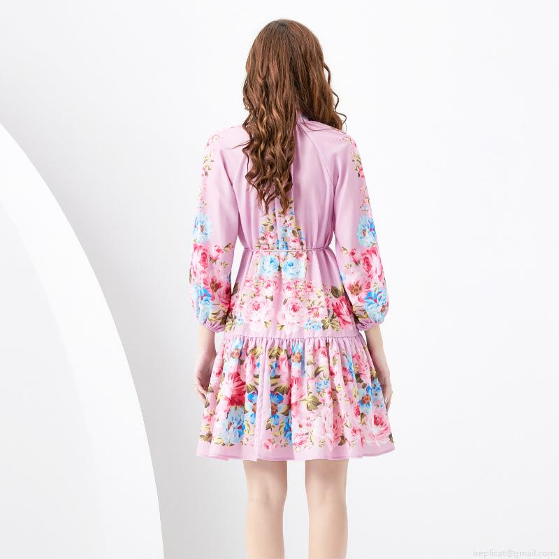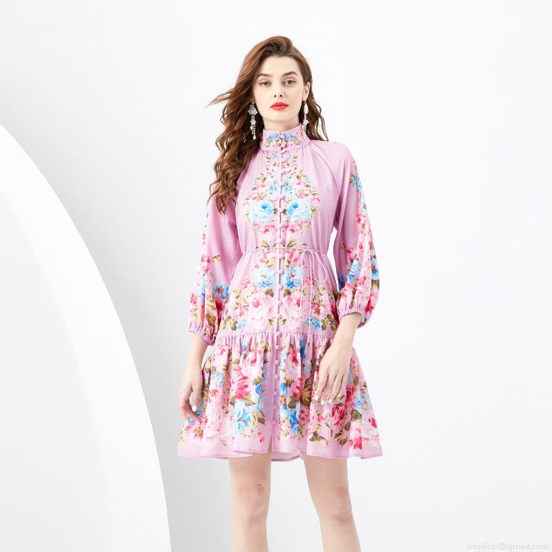 • Women's Retro Pink Floral Print Long Sleeve Midi Dress Stand Collar Woven Polyester Lantern Sleeve Elegant Ruffle Hem Button Front Summer Vacation Casual A-Line Dress