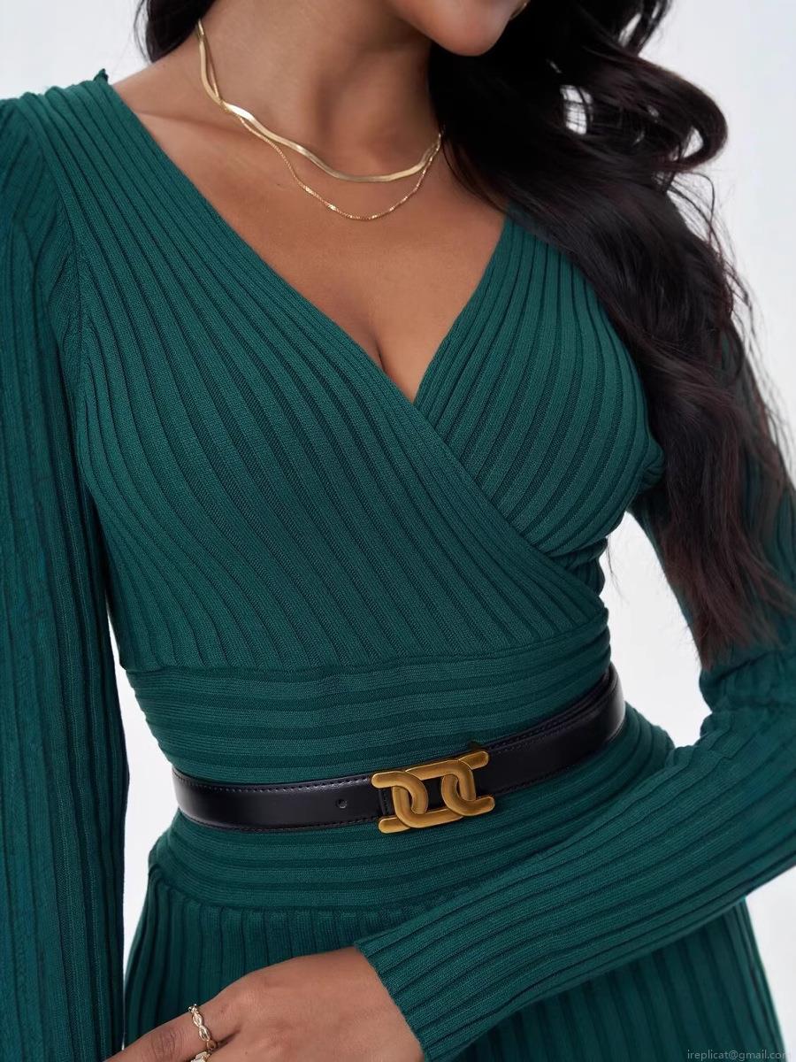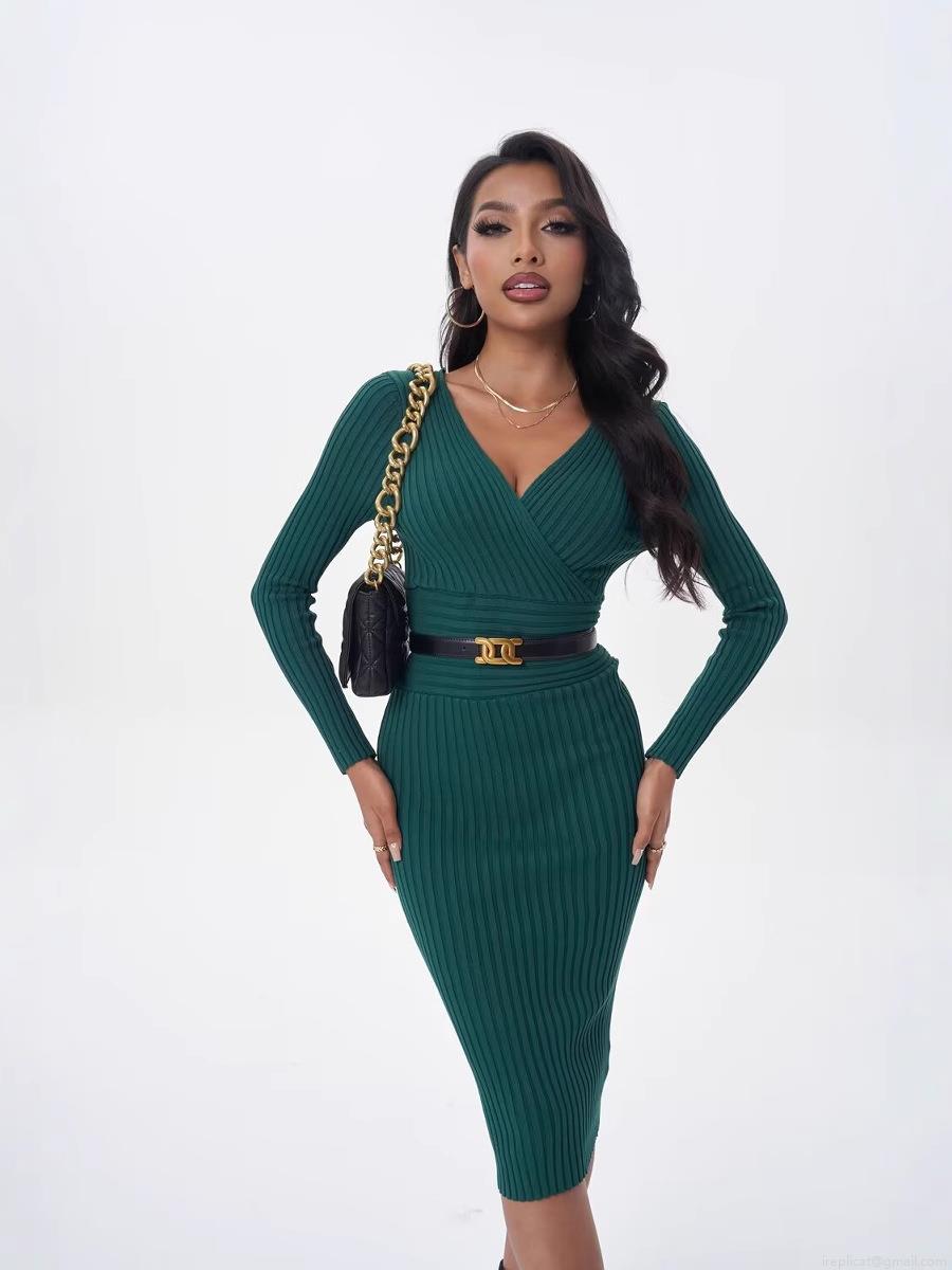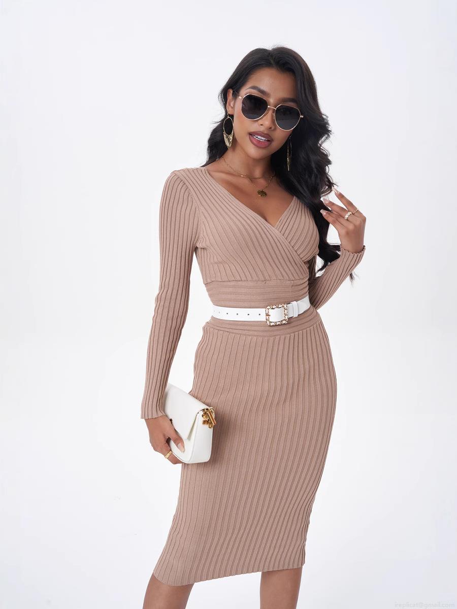 • Women's Ribbed Knit Midi Dress Sexy Double V-Neck Long Sleeve Slim Fit Wrapped Rayon Nylon Blend Solid Color Elegant Daily Wear Bodycon Dress