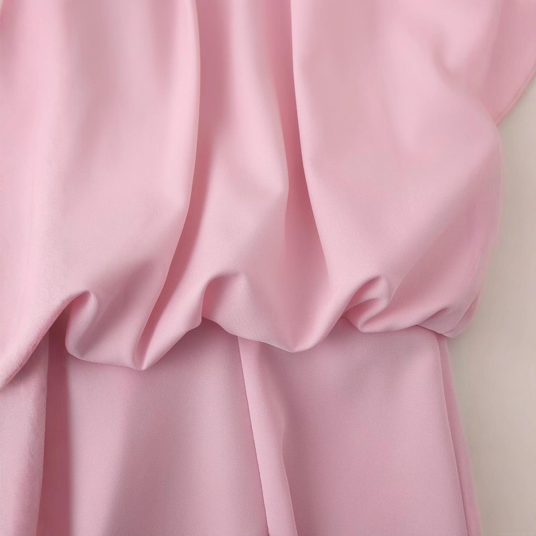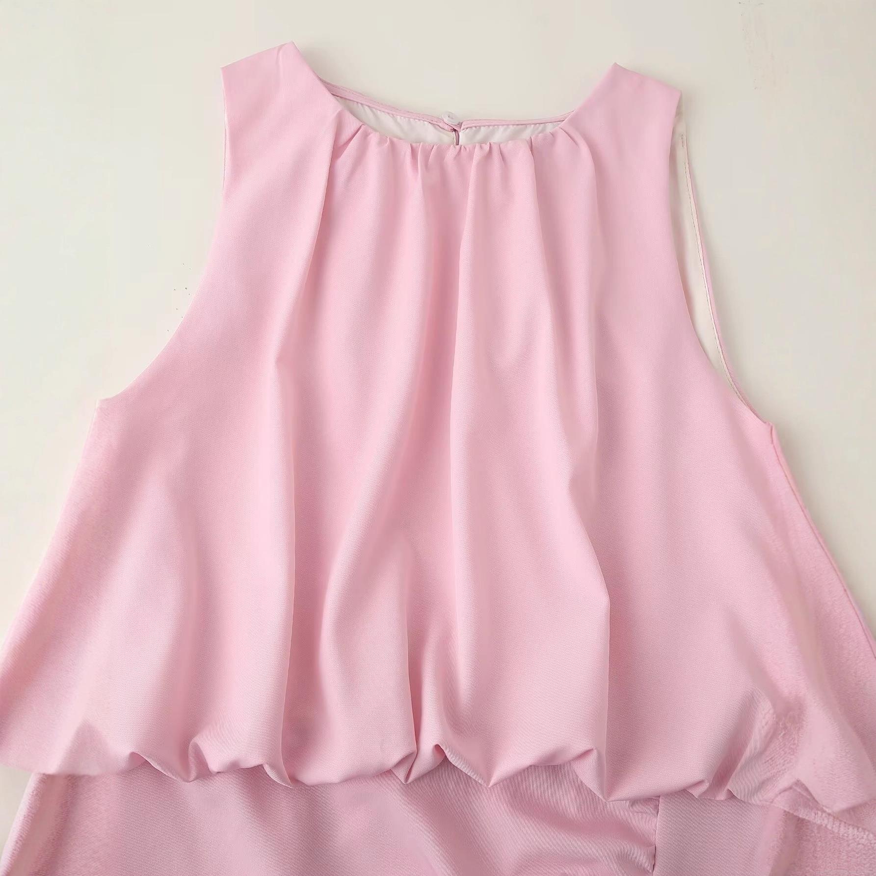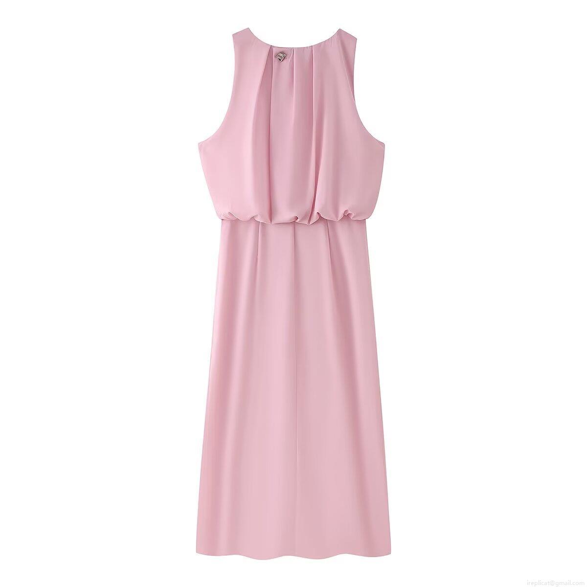 • Women's Round Neck Sleeveless Pink Midi Dress Elegant Pleated Ruched Waist A-Line Skirt With Side Slit Street Style Polyester Sundress For Party