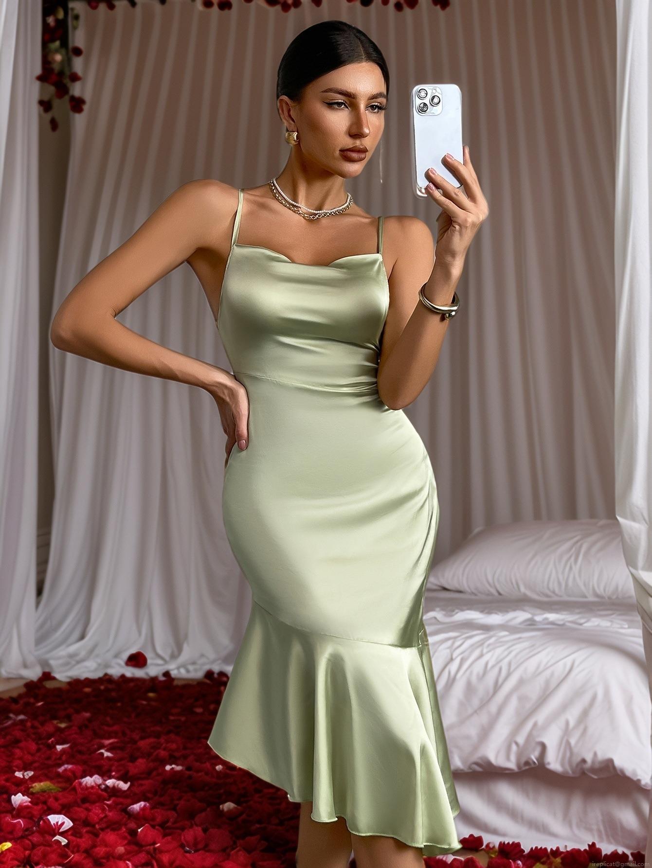 • Women's Satin Polyester Spandex Spaghetti Strap Midi Dress Ruffle Fishtail Backless Bow Bodycon Elegant Party Banquet Sexy Dress Light Green