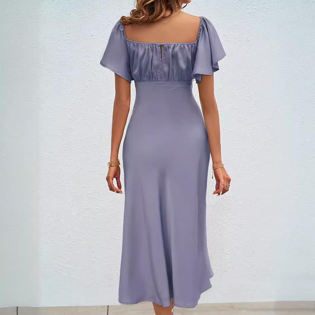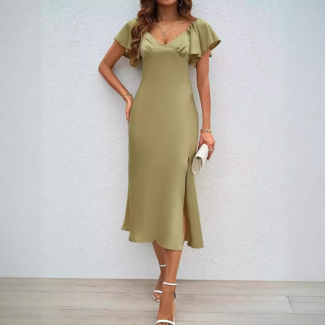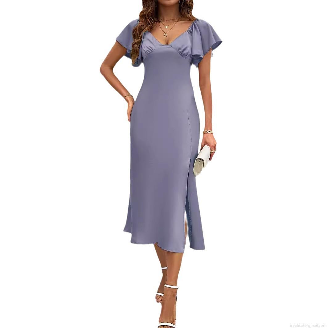• Women's Satin V-Neck Dress Sexy High Slit Midi A-Line Flutter Sleeve Summer Casual Solid Color Backless Party Gown for Ladies Elegant Evening Wear
