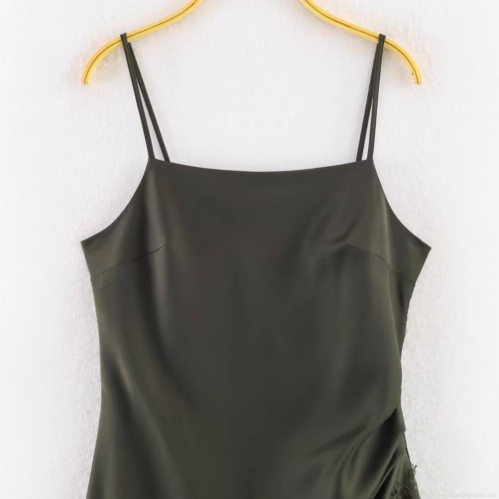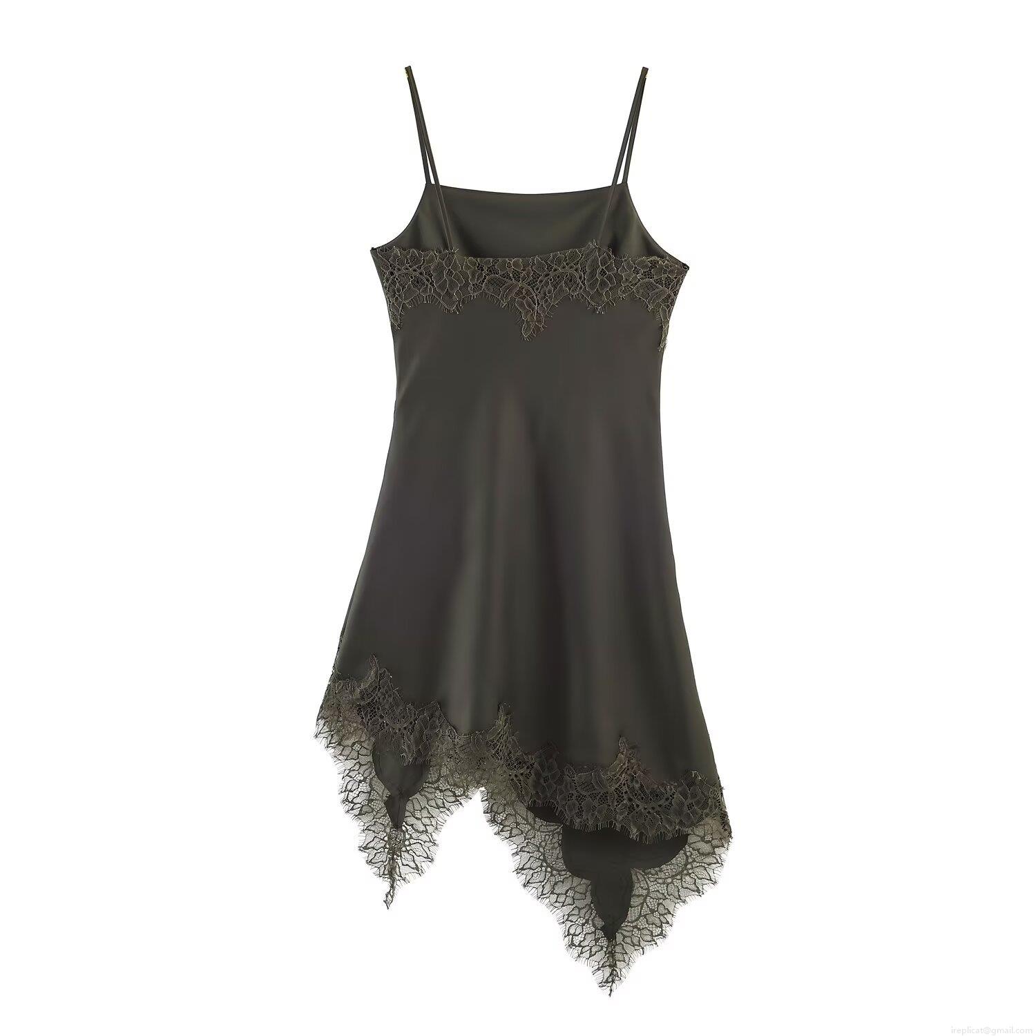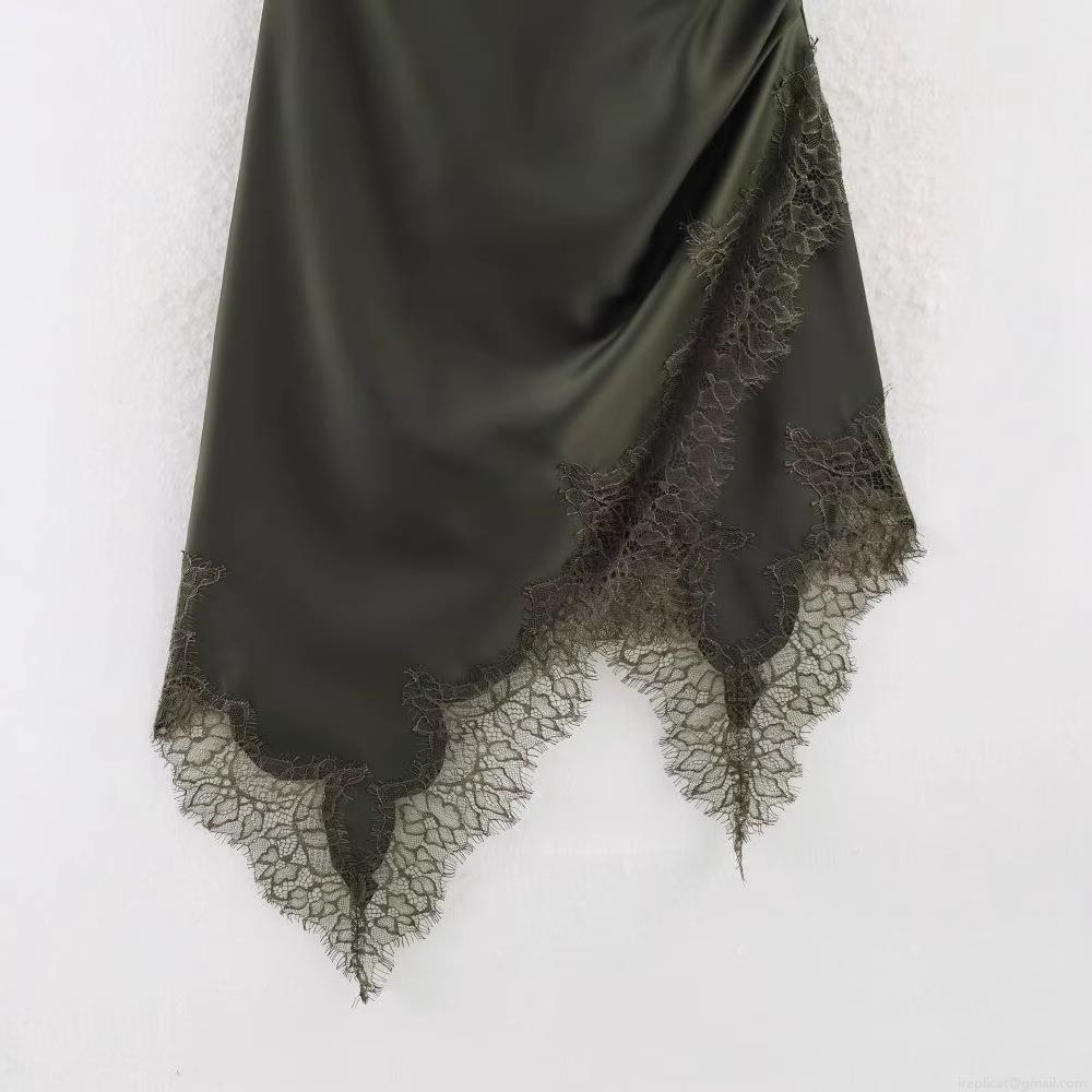• Women's Sexy Army Green Satin Cami Midi Dress With Lace Trim Asymmetrical Hem Elegant Slit Slip Dress For Party Date Night French Vintage Style