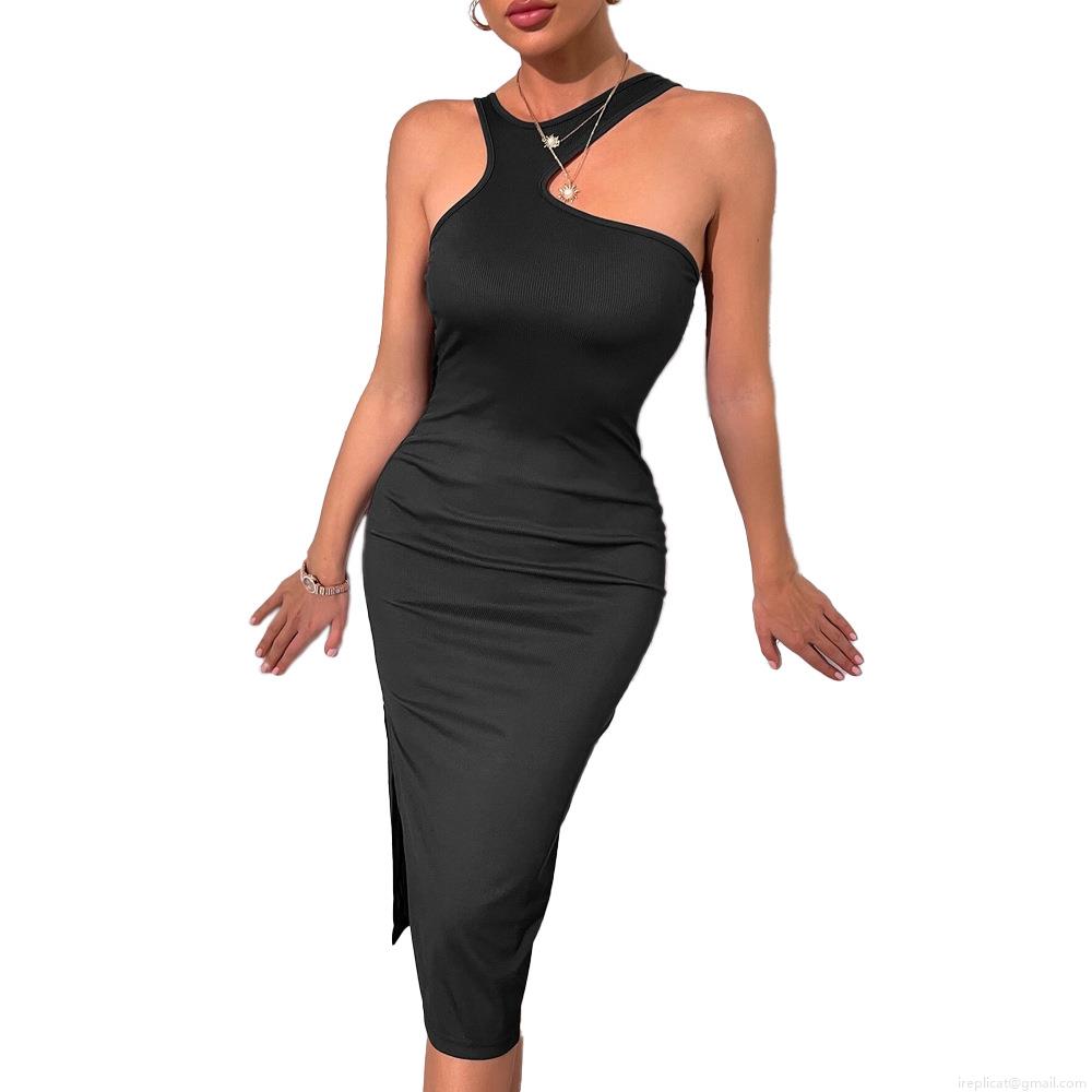 • Women's Sexy Asymmetric Cutout One Shoulder Ribbed Knit Midi Dress High Slit Slim Fit High Waist Solid Black Bodycon Dress For Party Evening Clubwear