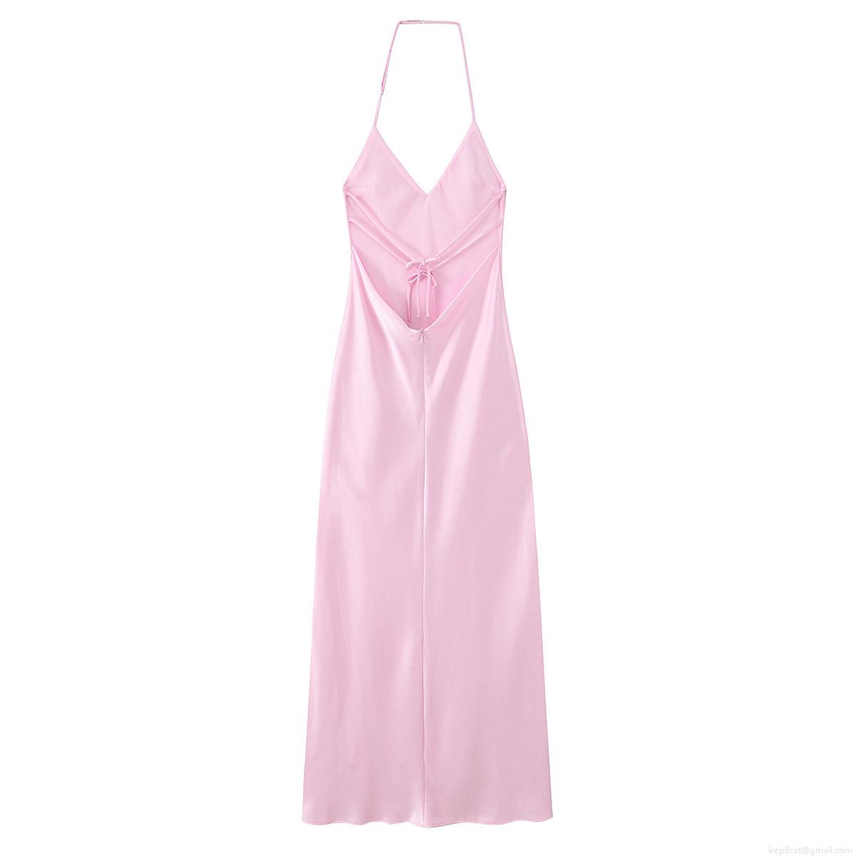 Women's Sexy Backless Halter Satin Midi Dress Crisscross Neck Sleeveless Solid Pink Silk Texture Summer Elegant Party Dress